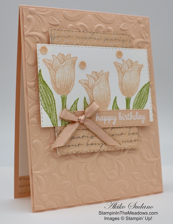 Good Morning! Welcome to another Happy Inkin’ Thursday Blog Hop! I have another sneak peek of the beautiful Stampin’ Up! Timeless Tulips stamp set along with the Parisian Blossoms specialty designer series paper and the Parisian Flourish embossing folder. Here is my card: