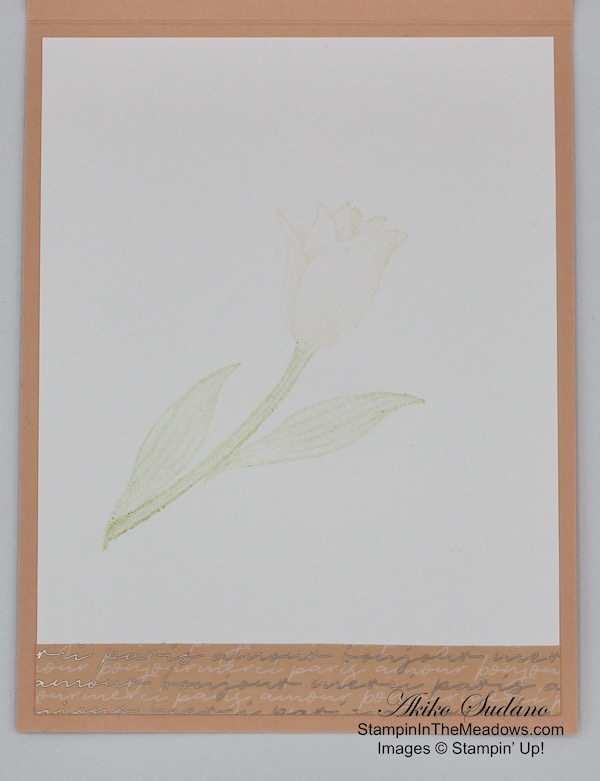 I decorated the inside of the card by stamping a tulip and stem on a Whisper White panel. I stamped the tulip in Petal Pink after stamping off once and I stamped the leaves and stem in Pear Pizzazz after stamping off twice. I added a strip of the Parisian Blossoms DSP to the bottom and adhered it to the inside of the card.