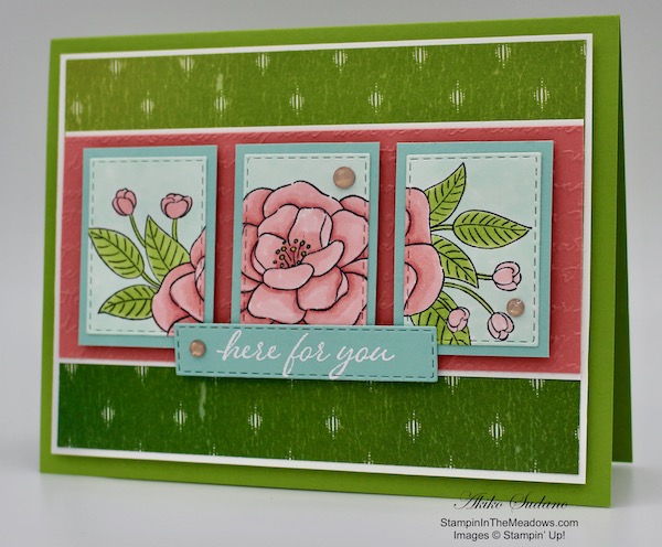 - Whisper White – 3-3/4″ x 5″ (inside panel), 3-7/8″ x 5-1/8″ (front background mat), 2-1/4″ x 5″ (embossed panel mat), (3) 1-1/2″ x 2″ (die cut floral panels)