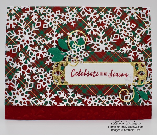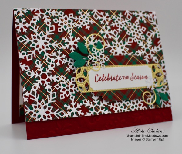 Emboss a Rich Razzleberry panel with the Ornate Floral 3D embossing folder and adhere it to the front of a Rich Razzleberry card base. Cut a Terracotta Tile panel with the Ornate Layers Die and adhere a panel of Plaid Tidings designer series paper to the front. Adhere the layered die cut to the front of the card. Cut and embossed three leaves from the Nature’s Roots dies in Bumblebee and adhere them to the bottom of the panel. Cut some branches from the Forever Gold Laser Cut specialty paper and adhere them to the top of the leaves.