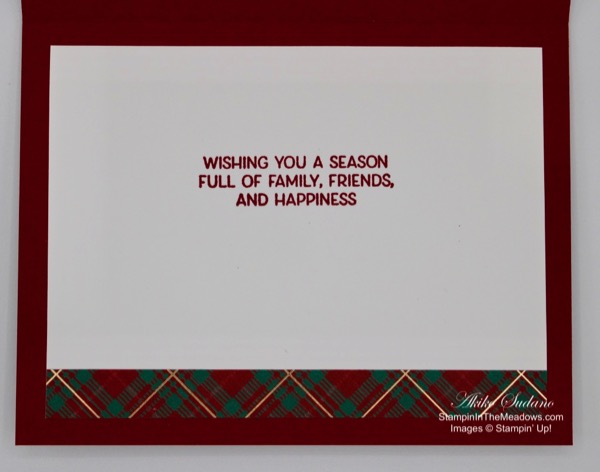 Stamp the sentiment from the Sending Sunshine stamp set in Rich Razzleberry ink on a Whisper White panel. Stamp the flower from the Stampin’ Up! Ornate Style Stamp set in Early Espresso ink next to the sentiment and color it with Mango Melody, Granny Apple Green and Mossy Meadow Stampin’ Blends. Cut a strip of Terracotta Tile with the Ornate Borders die and adhere a strip of Plaid Tidings DSP to the bottom. Adhere it to the bottom of the Whisper White panel and adhere the panel to the inside of the card.