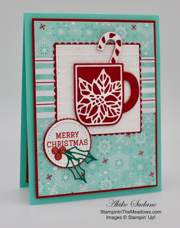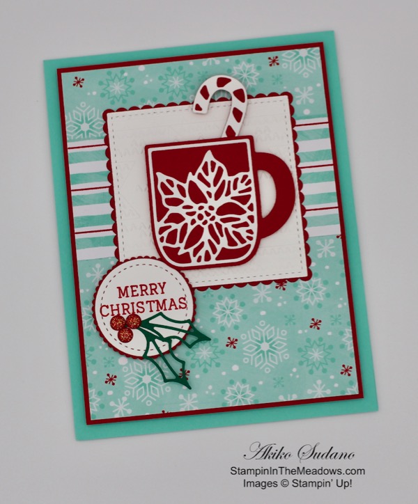 I stamped the Merry Christmas greeting from the Stampin’ Up! Cup of Christmas stamp set in Real Red on a panel of Whisper White and cut it out with a stitched circle die. I matted in a Real Red scalloped circle and added two Shaded Spruce die cut holly leaves and three Real Red enamel glitter dots. I adhered the label to the Let it Snow panel with dimensionals and then adhered the finished panel to a Coastal Cabana card base with dimensionals.