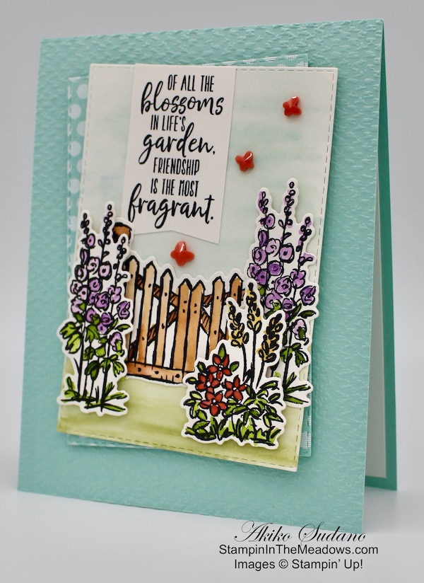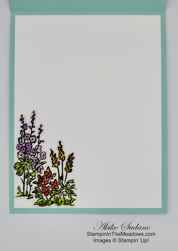 I stamped the grasses from the Stampin’ Up! Field of Flowers stamp set in Old Olive ink on the bottom of a Whisper White panel and bartered some Old Olive ink on the bottom. I stamped the dragonflies on the panel along with the my friend sentiment in Misty Moonlight ink. I adhered the panel to the inside of the card.