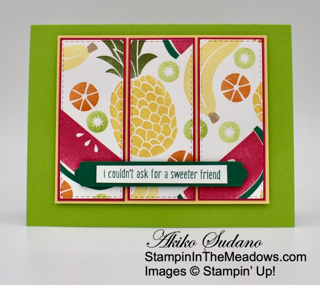 I embossed a Pretty Peacock panel with the Seabed 3D embossing folder and adhered it to the front of a Pretty Peacock card base. I cut out a panel of the Whale of a Time 6″ x 6″ designer series paper with the third largest Stitched Rectangles die and adhered it to a Bermuda Bay mat. I adhered the DSP panel to the the card front on an angle.