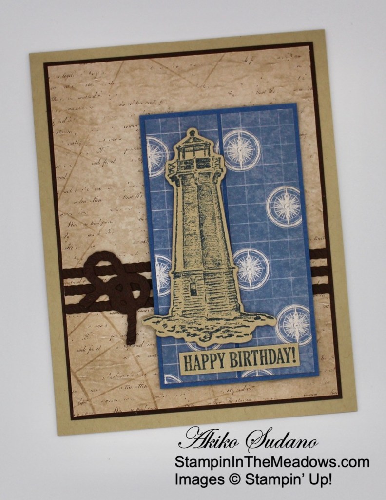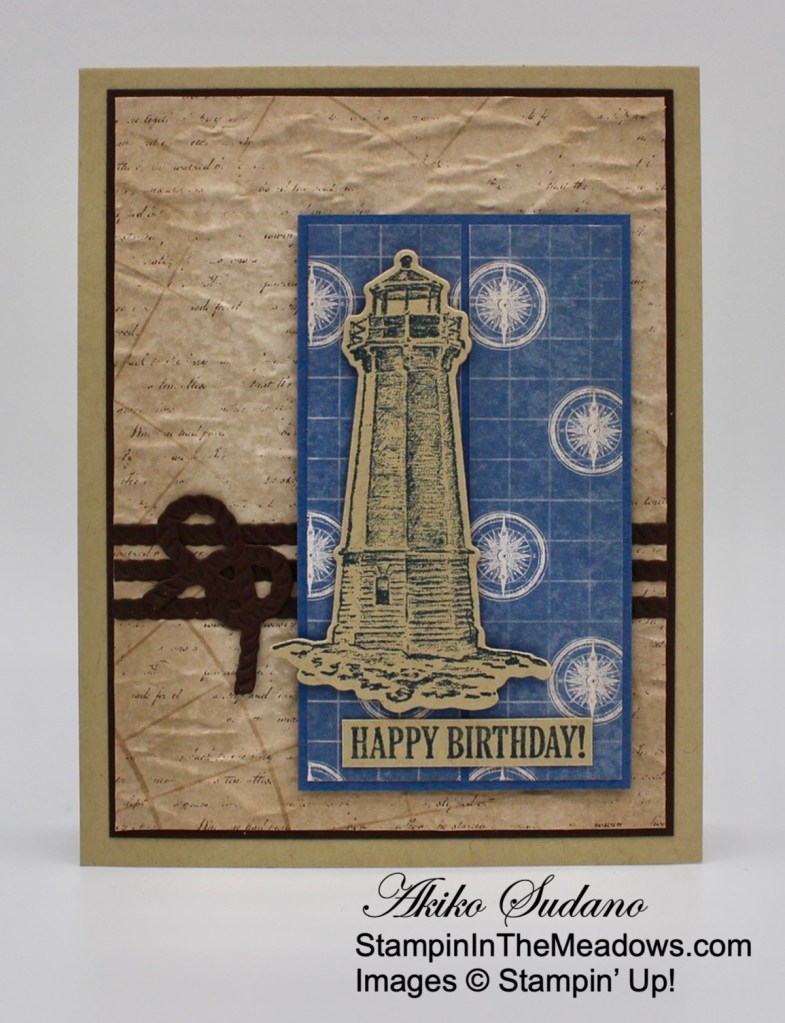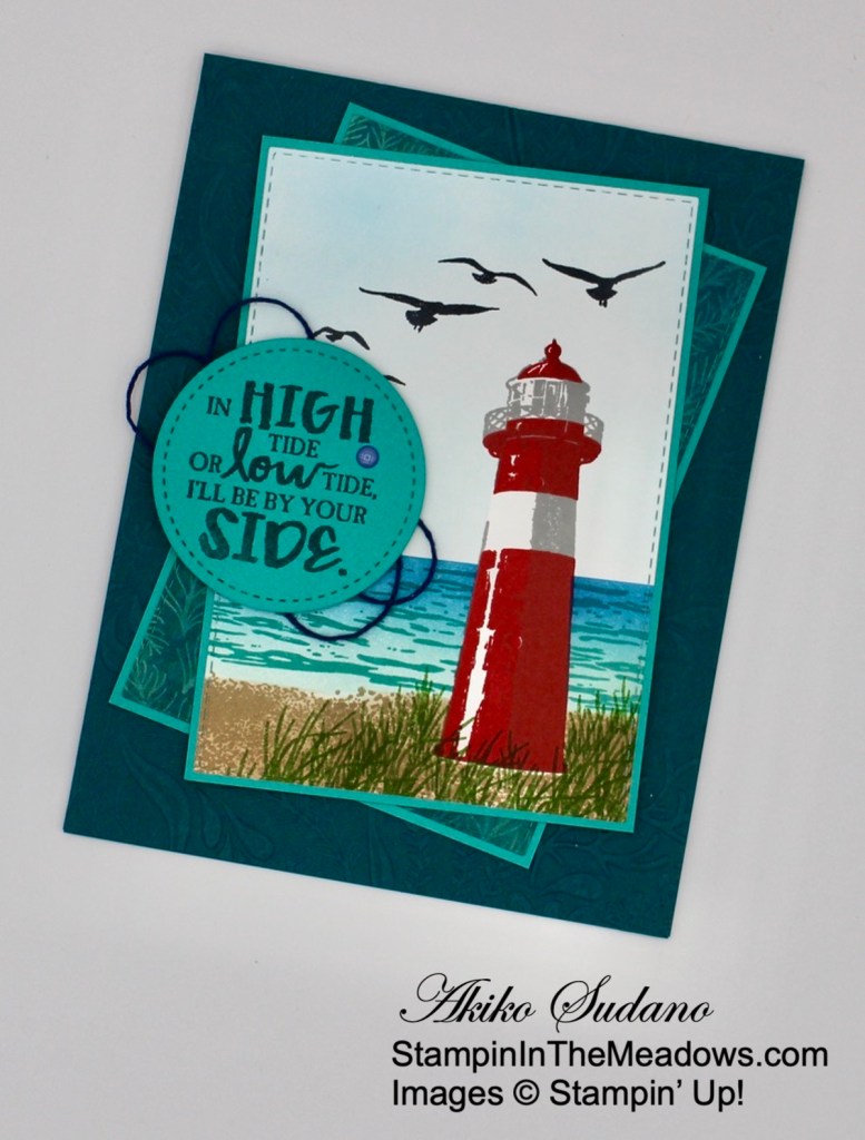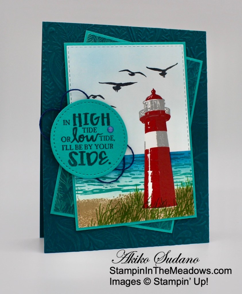 I used a blending brush to apply Crumb Cake ink on the bottom of the panel over the sand. I stamped the grasses from the Stampin’ Up! High Tide stamp set in Garden Green ink around the base of the lighthouse. I used my blending brush again to apply Balmy Blue and Pacific Point inks to the sky and stamped the birds in Memento Tuxedo Black ink. I cut the panel out with the third largest Stitched Rectangle die and adhered it to a Bermuda Bay mat and then to the card front. I stamped the sentiment in Pretty Peacock on a Bermuda Bay panel and cut it out with the second smallest circle from the Stitched Shapes dies. I adhered a couple of loops of Misty Moonlight twine to the card front and popped the label on top with dimensionals. I finished the card with a Misty Moonlight enamel dot on the label.