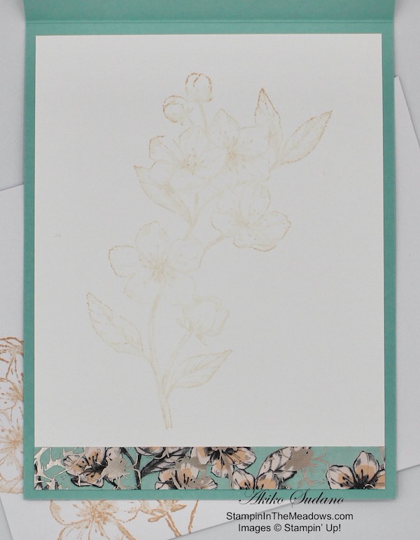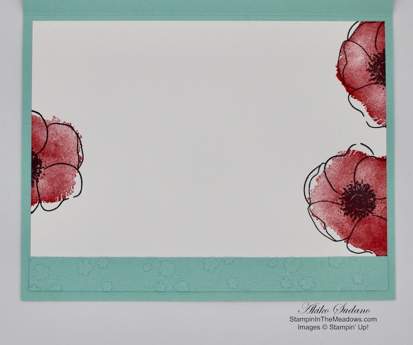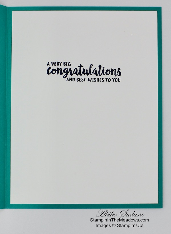 I stamped the sentiment from the Stampin’ Up! Dove of Hope stamp set in Pacific Point ink on a Whisper White panel. I stamped dove in Pool Party ink after stamping off, and trimmed the bottom with a strip of the Snowflake Splendor DSP. I adhered the panel to the inside of the card with Stampin’ Seal.