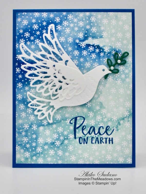 I stamped the Peace on Earth sentiment from the Stampin’ Up! Dove of Hope stamp set in Pacific Point ink on a panel of the new Snowflake Splendor designer series paper and adhered the panel to the front of a Pacific Point card base.