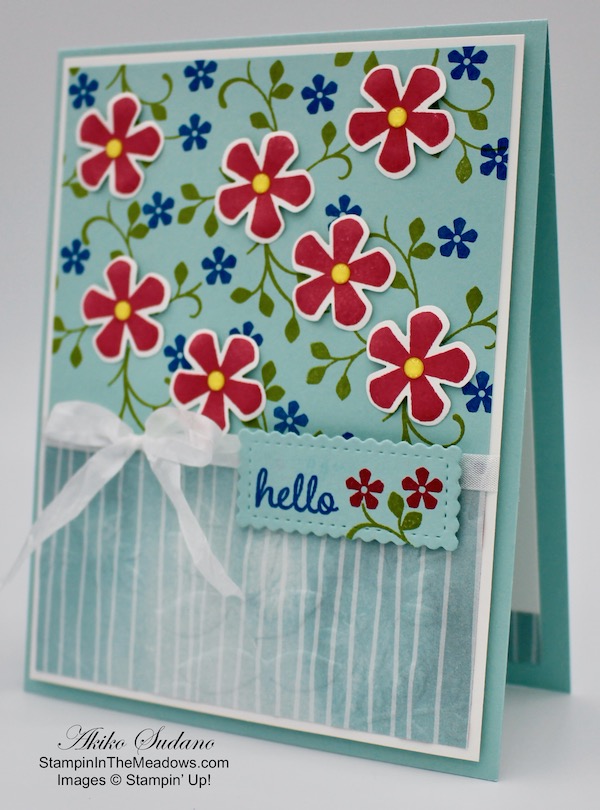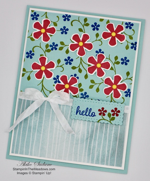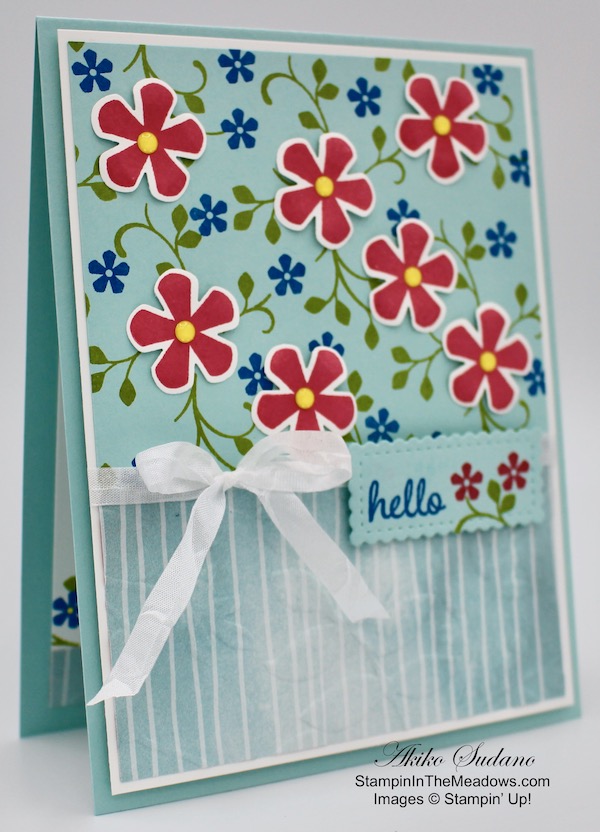 I embossed a panel of the Pool Party striped Peaceful Poppies designer series paper with the Layered Leaves embossing folder. I adhered the floral Pool Party panel to the top of a Whisper White mat and the embossed DSP to the bottom with snail. I tied a length of Whisper White crinkle seam binding around the middle and made a bow. I adhered the layered panel to a Pool Party card base with dimensionals. I stamped the hello sentiment from the Timeless Tulips stamp set in Pacific Point ink on a strip of Pool Party. I added some small Melon Mambo flowers and a leaf sprig from the Stampin’ Up! Thoughtful Blooms stamp set and cut it out with the small scalloped rectangle from the stitched so sweetly dies. I popped it on the card front with dimensionals.