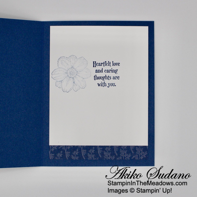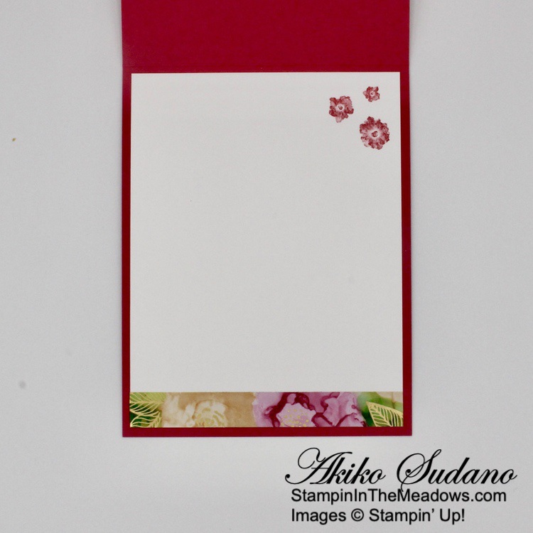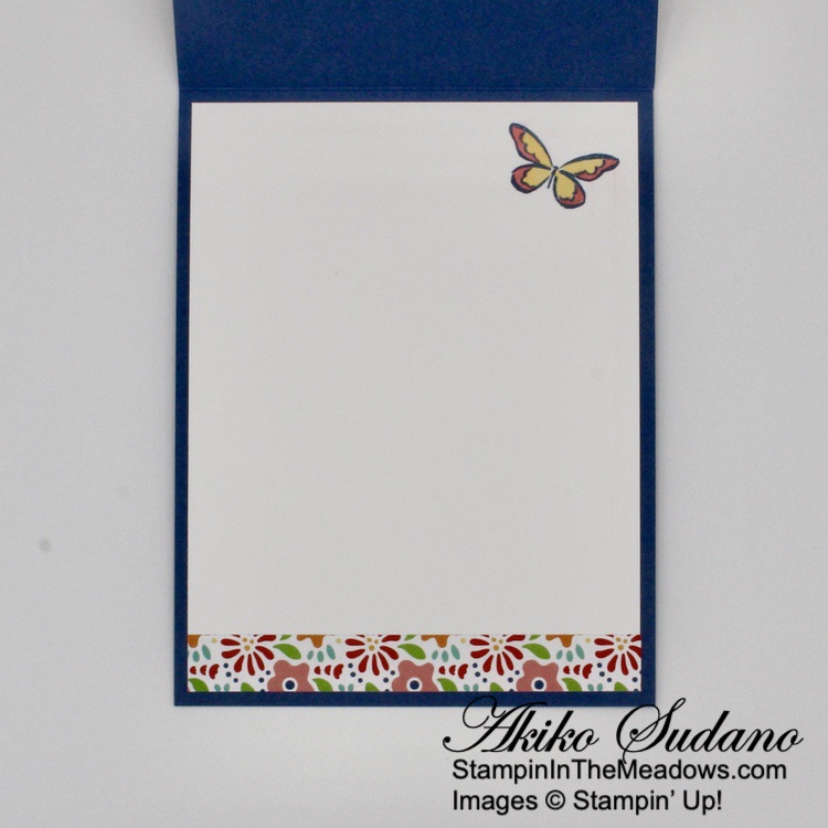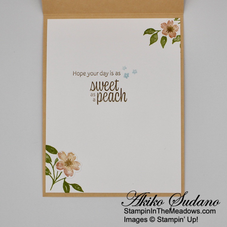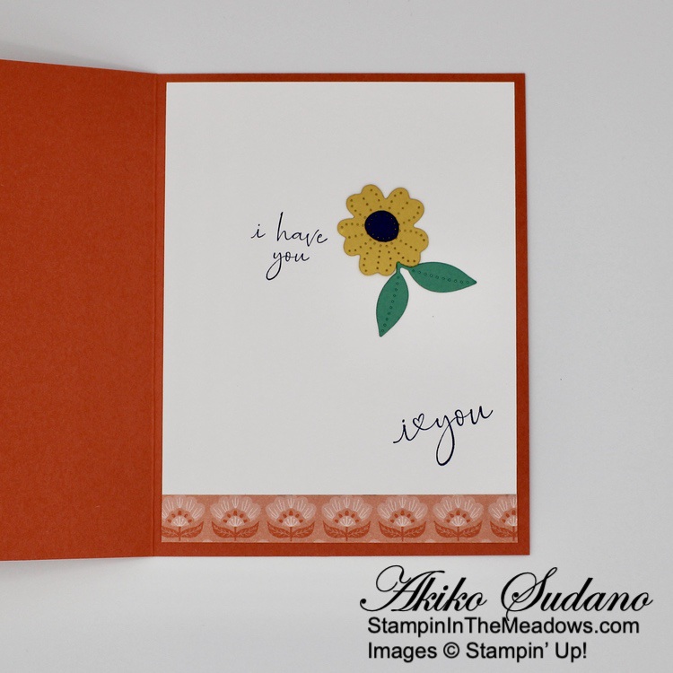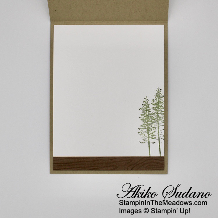 For the inside of the card, I stamped the trees from the Stampin’ Up! Grassy Grove stamp set in Mossy Meadow on a Basic White panel. I trimmed the bottom of the panel with a strip of wood grained Beauty of the Earth DSP and adhered it to the inside of the card.