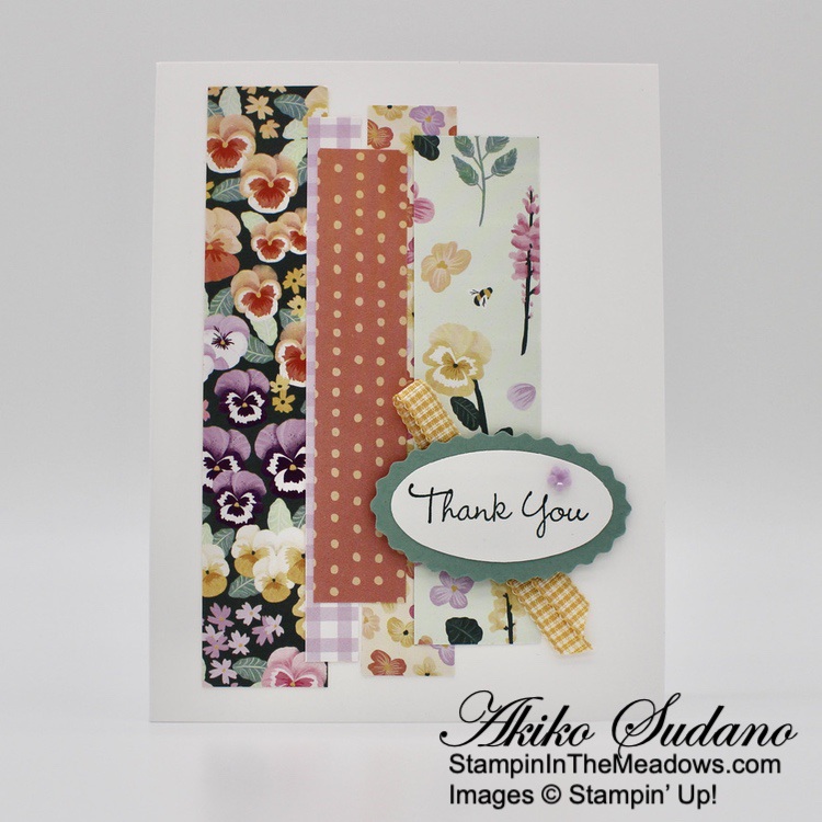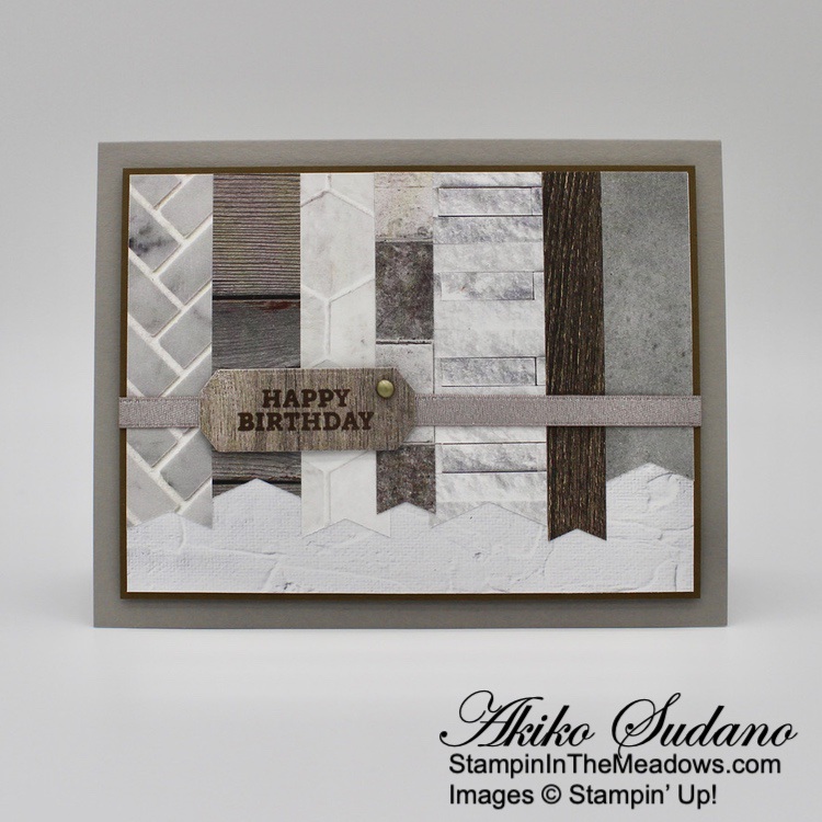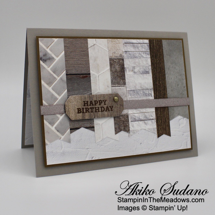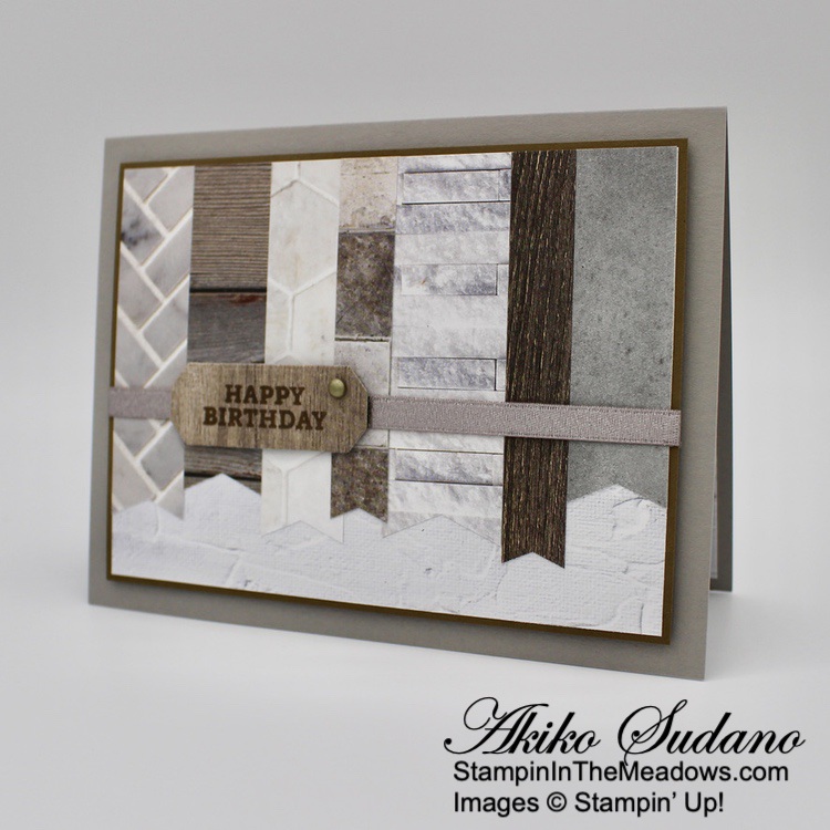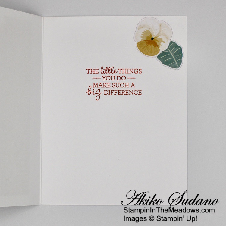 I adhered a strip of wood grained Beauty of the Earth DSP to the front of a Crumb Cake card base and adhered the little scene with liquid glue. I stamped the sentiment from the Stampin’ Up! Grassy Grove stamp set in Mossy Meadow on Pear Pizzazz and cut it out with the Messages die. I adhered the label to the frame with glue dots and finished the card front with adhesive pebbles.