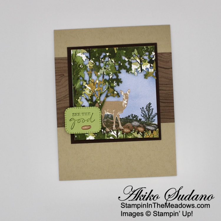 I stamped the long ground stamp with shrubs from the Stampin’ Up! Grassy Grove cling stamp set in Mossy Meadow on a blue sky panel of the Beauty of the Earth DSP. I sponged Cinnamon Cider ink on the ground with a sponge dauber, and it nicely covered the blue sky, so my ground looked realistic. I stamped the deer in Crumb Cake on Basic White and fussy cut it out. There is a die that works nicely, but I didn’t want the white edge for such a small focal piece. I adhered the deer to the stamped panel with liquid glue and adhered the die cut wooded frame with dimensionals. I adhered the layered panel to an Early Espresso mat.