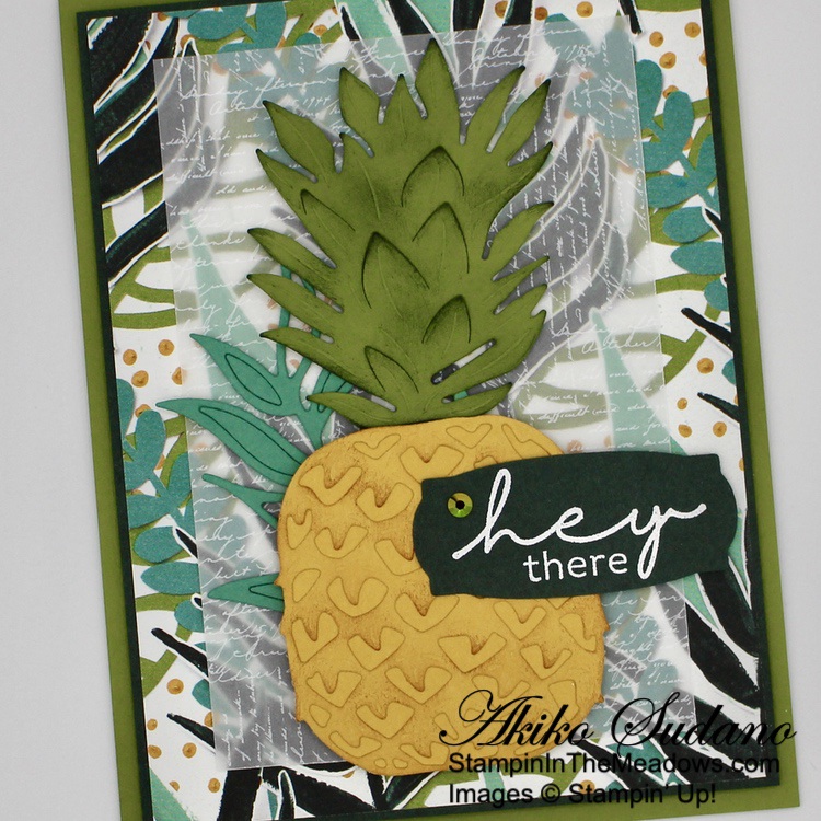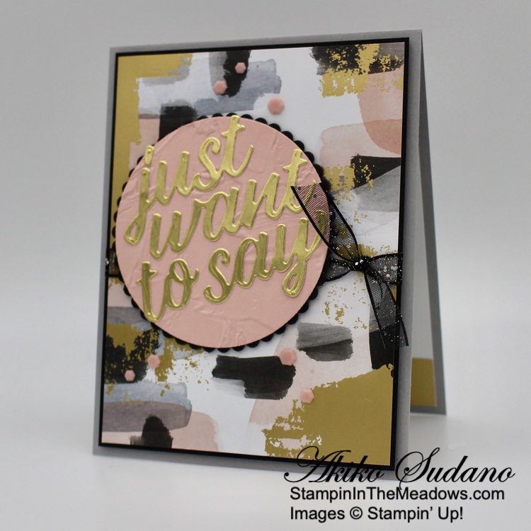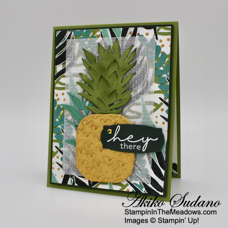 I cut some Evening Evergreen leaves from the Pansy Patch DSP and tucked them under the large pansy. I stamped the sentiment from the Stampin’ Up! Pansy Patch stamp set in Evening Evergreen ink on Pale Papaya and cut it out with the Ornate Frames die. I adhered it to the card front. I finished off the card with a Pale Papaya bow and some iridescent gems, adding a large one to the pansy center!