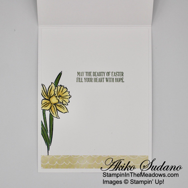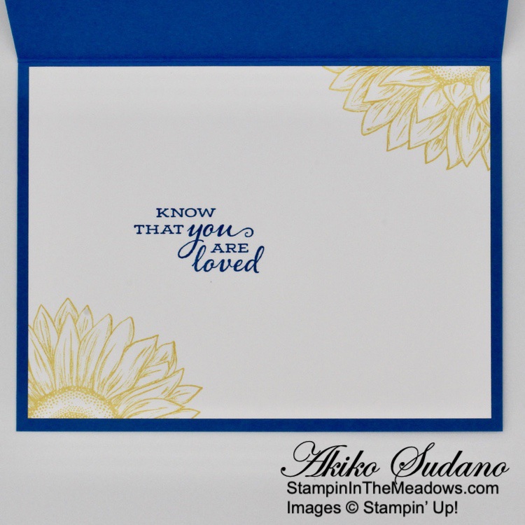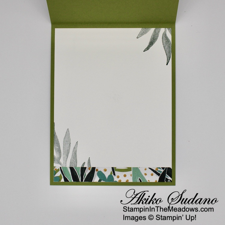 For the inside, I stamped the sentiment from the Stampin’ Up! Pansy Patch stamp set in Evening Evergreen on a Basic White panel. I cut out a small pansy from the Pansy Patch DSP and adhered it to the corner and adhered the panel to a Calypso Coral mat. I adhered the panel to the inside of the card with liquid glue, lining it up so that it would be covered by the front panel.