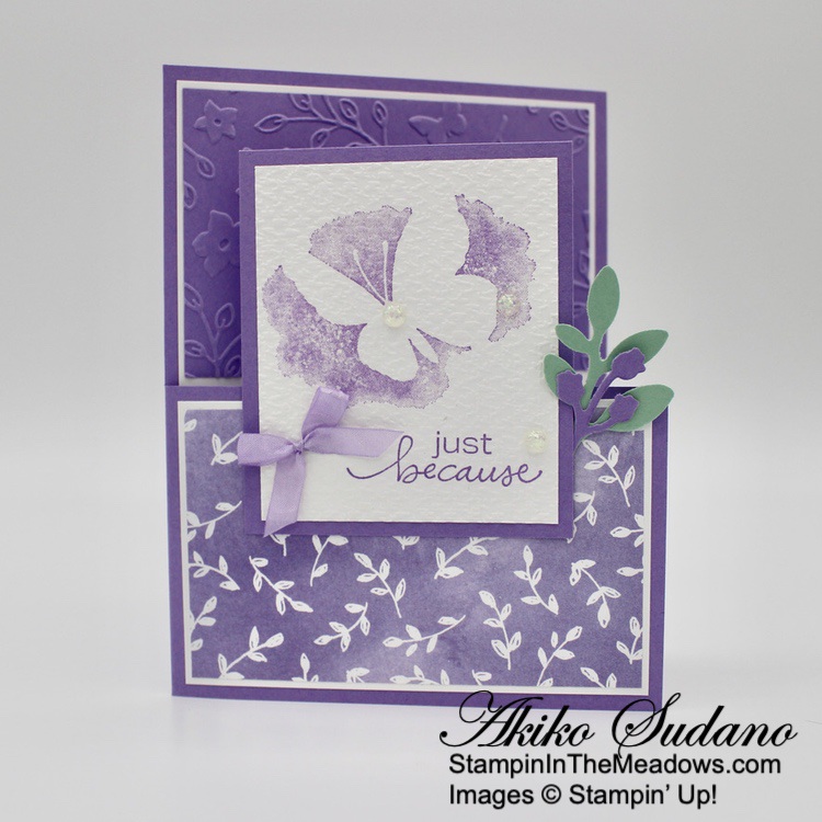 This card is kind of a fun fold card, where the card front is cut in half and turned sideways, so part of the inside of the card is showing – perfect for showing off pretty DSP. So I adhered panels of the pansy filled Pansy Petals designer series paper to the inside and to the front of a my Calypso Coral card base. I adhered a Calypso Coral dotted panel of the Pansy Petals DSP to the cut off front panel, and adhered it to the card front with Tear & Tape, centering the panel on the card.