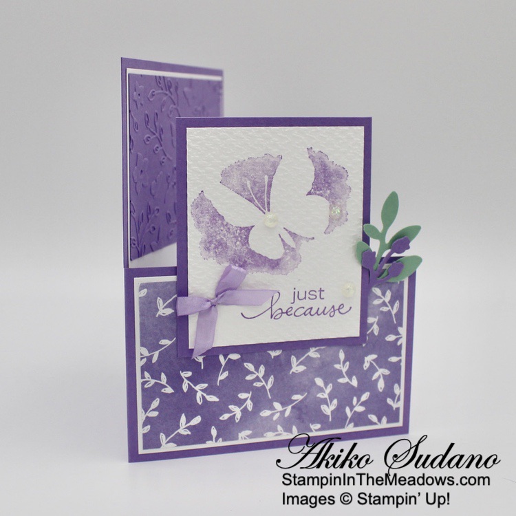 - Pansy Petals DSP – 4″ x 5-1/4″ (inside panel), two 2-1/2″ x 4″ panels (front panels), small die cut pansy, two evening evergreen die cut leaves