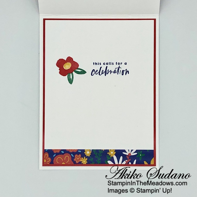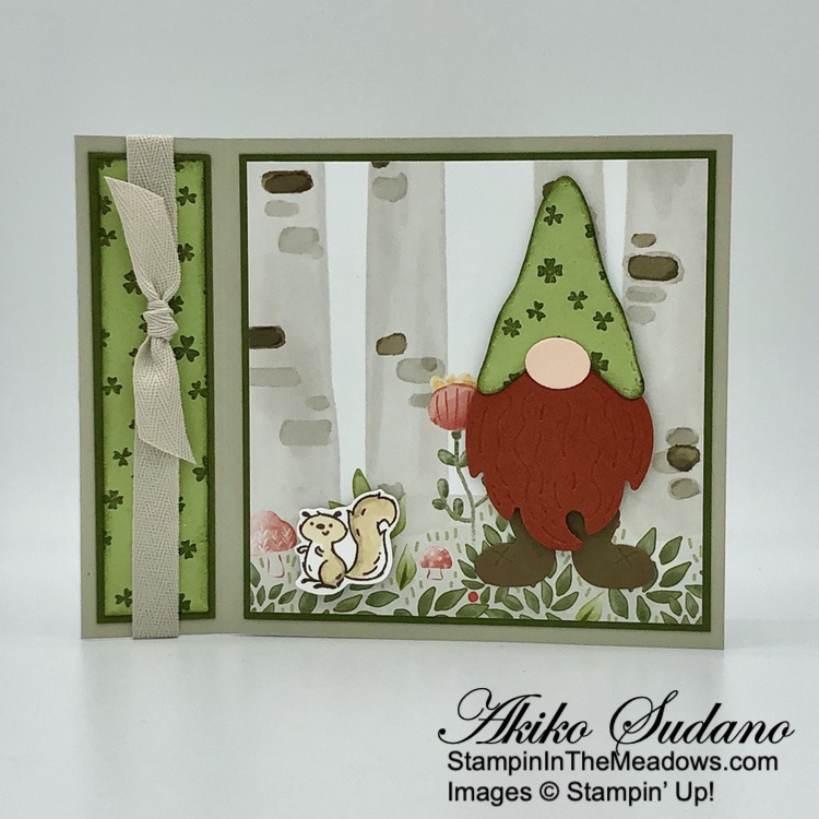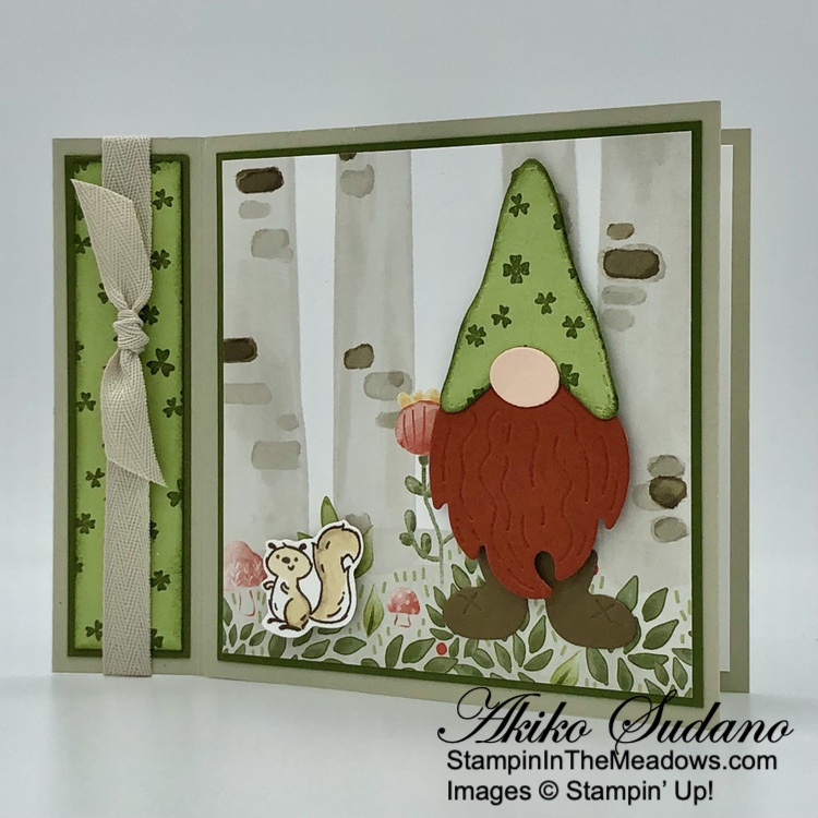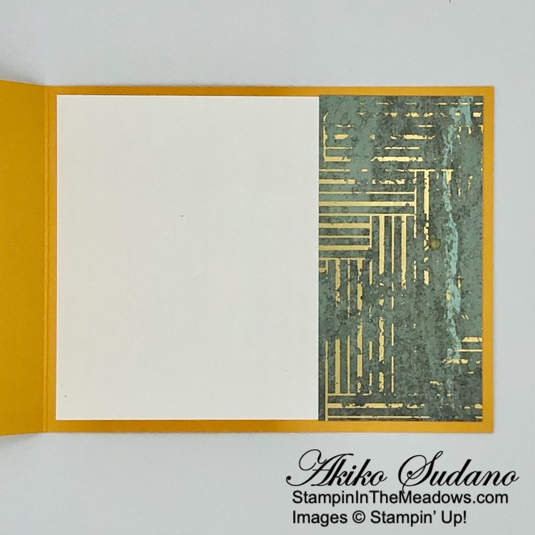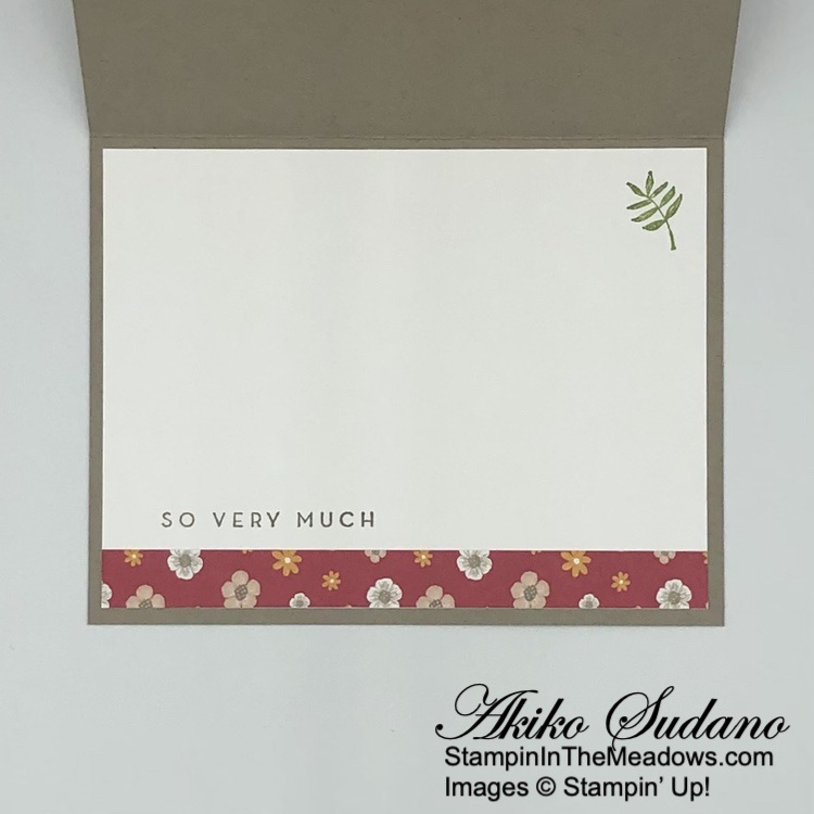 For the inside of the card, stamped the leaf cluster from the Kind and Sincere stamp set in Granny Apple Green ink in the corner of a Basic White panel. This is another retiring stamp set that is great for thank you cards – I love all the sentiments in it! I stamped the sentiment from the stamp set in Crumb cake and trimmed the bottom with a strip of Tea Boutique DSP before adhering the panel to the inside of the card.