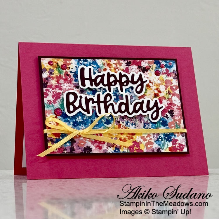 I adhered pretty panel of Bloom Impressions designer series paper to a Blackberry Bliss mat. This pretty DSP pack is a Sale-A-Bration item that will be available for FREE with a $60 order during Sale-A-Bration beginning January7, 2025. I wrapped it with a length of Daffodil Delight ribbon (from the upcoming Jan-Apr Mini Catalog available Jan 7) and tied a bow. I popped the panel on the front of a Melon Mambo card base with dimensionals.