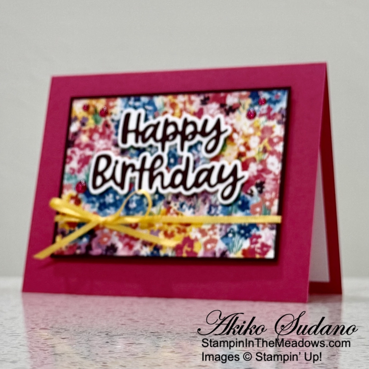Good Morning! Here’s a simple birthday card using the pretty die cut sentiment from the Stampin’ Up! Wanted to Say dies and a panel of the new Sale-A-Bration designer series paper Bloom Impressions. You can find the currently available supplies I used along with card stock cuts at the bottom of my post.