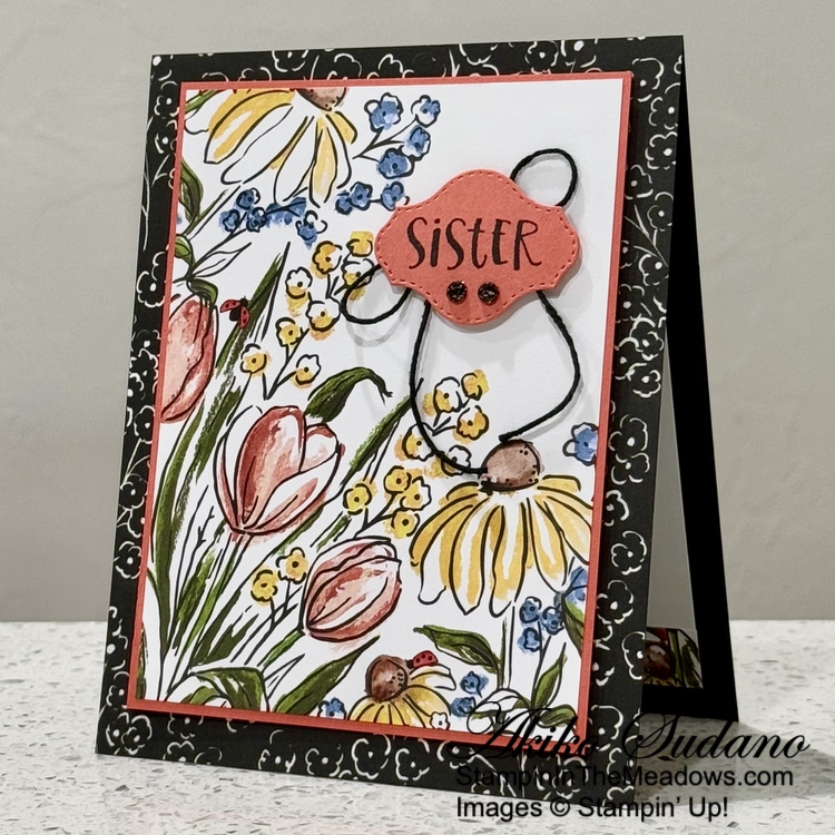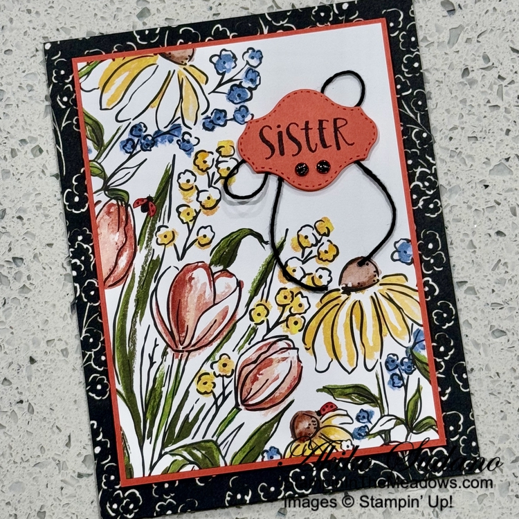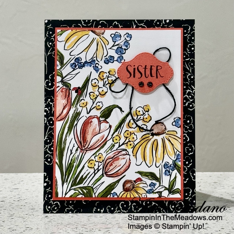 I adhered a pretty floral bouquet panel of Mixed Media Florals DSP to a Calypso Coral mat and popped it on the card with dimensionals. It’s such a pretty design and goes beautifully against the black and white floral background.