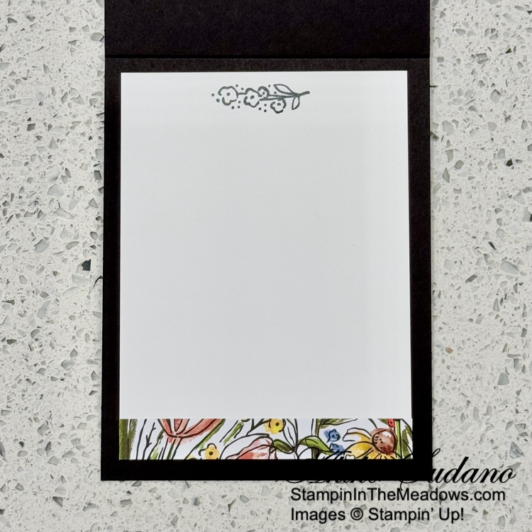 For the inside panel, I stamped the floral sprig from the Mixed Labels stamp set using Memento Tuxedo Black ink on a Basic White panel. I trimmed the bottom with DSP and adhered the panel to the inside of the card with Stampin’ Seal.
