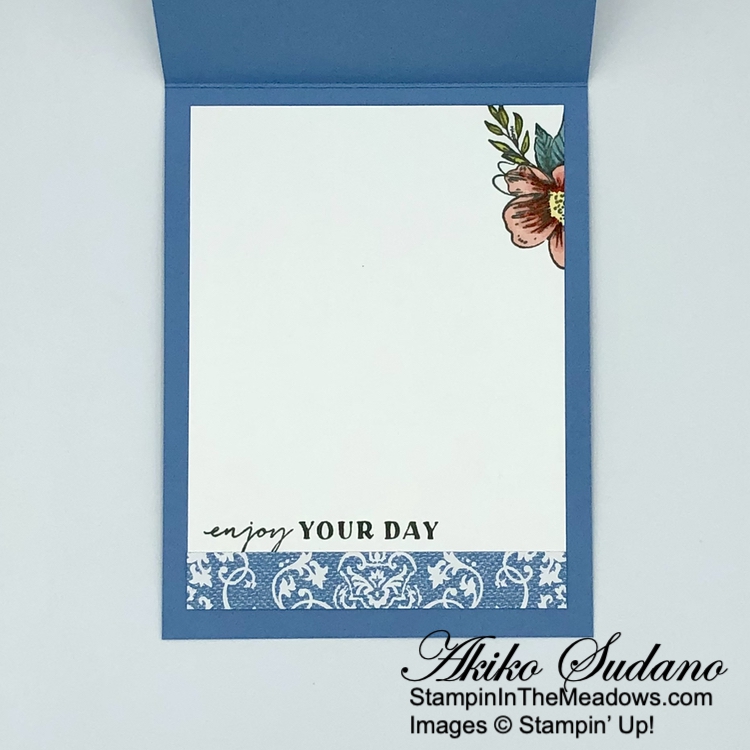 For the inside of the card, I inked up the mushroom stamp from the Stampin’ Up! Inspirational Sketches stamp set using Pecan Pie ink and stamped it off three times before stamping it on a Basic White panel. I trimmed the bottom with DSP and adhered the panel to the inside of the card with Stampin’ Seal.