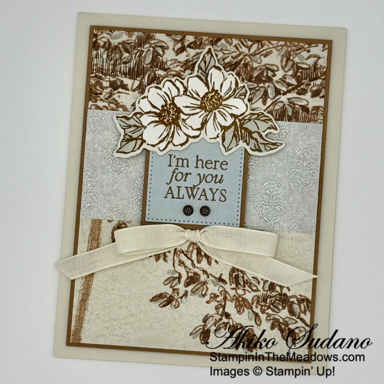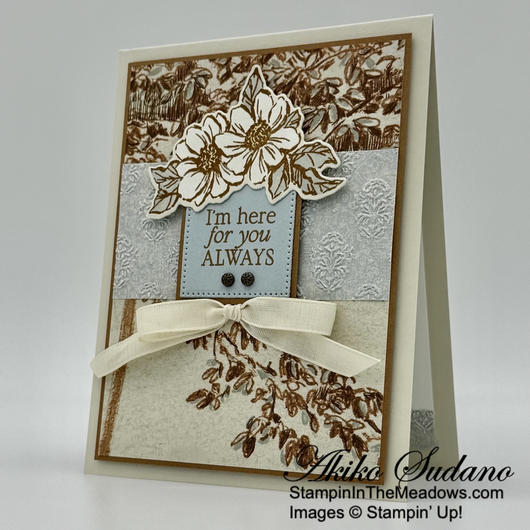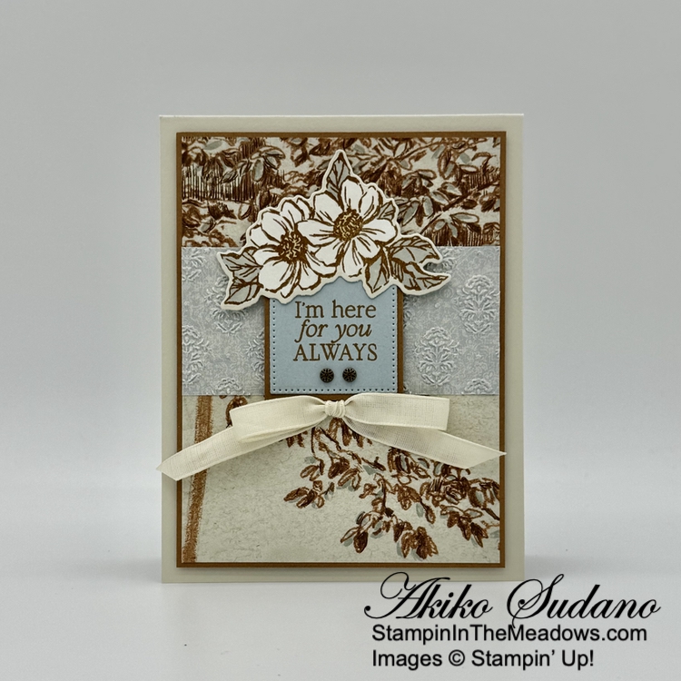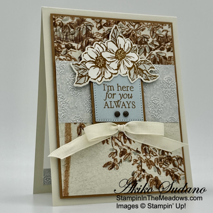 I love that the stamped and die cut flowers from the Stampin’ Up! Beautiful Motifs and Gallery Blooms stamp sets are similar to the flowers in the Peaceful Garden DSP. I wonder if I should have put mats behind the smaller DSP panels. What do you think?