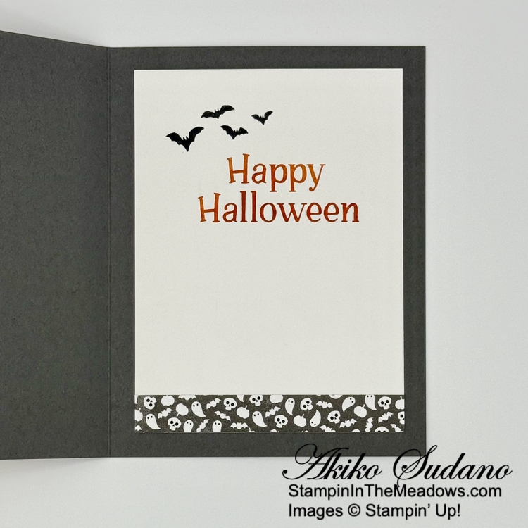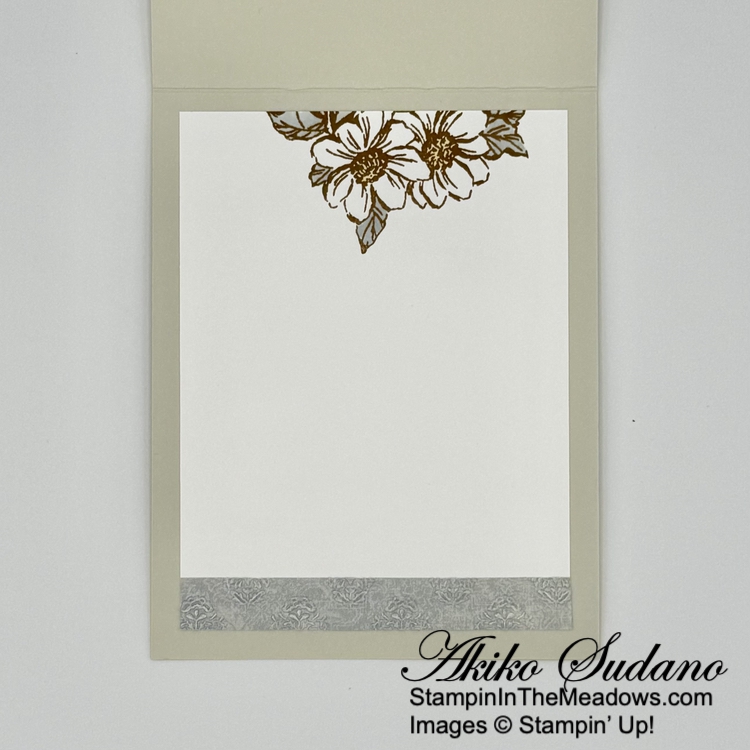 For the inside panel, stamp the wildflower from the Gallery Blooms stamp set using Misty Moonlight ink in the corners of a Basic White panel. Trim the bottom with DSP and adhere the panel to the inside of the card with Stampin’ Seal.