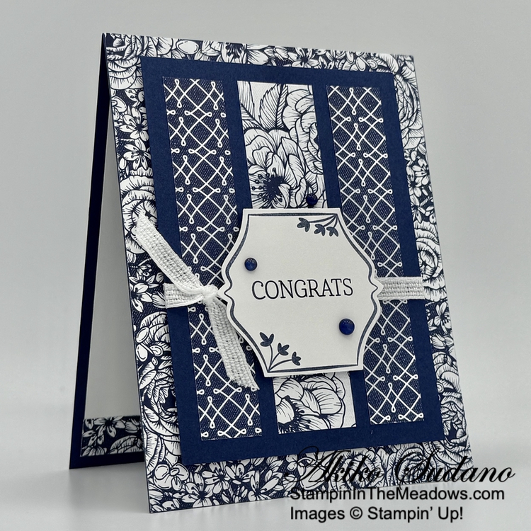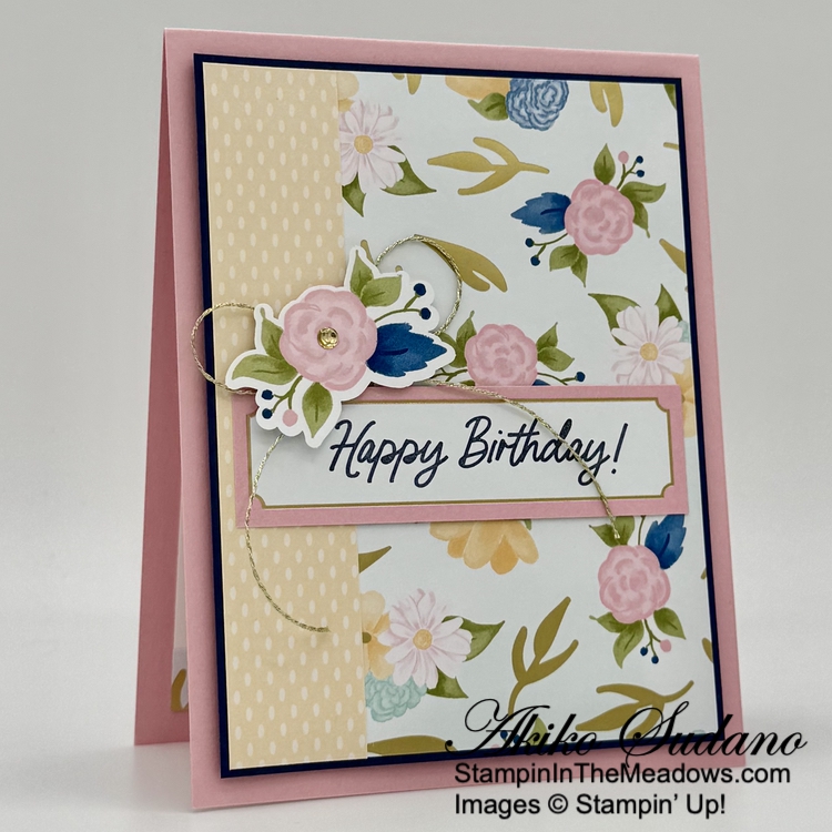 I adhered a Peach Pie panel of the beautiful Wildflower Birthday specialty designer series paper to the side of a floral panel with gold foil accents. I adhered the layered panel to a Night of Navy mat and popped it on the front of a Pretty In Pink card base with dimensionals.