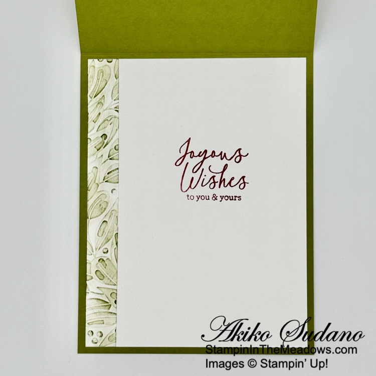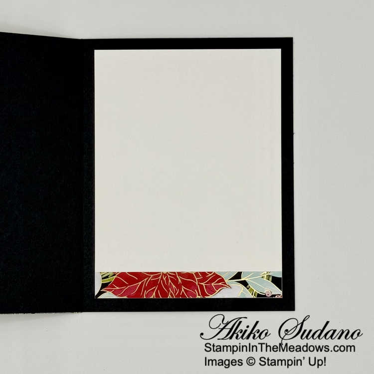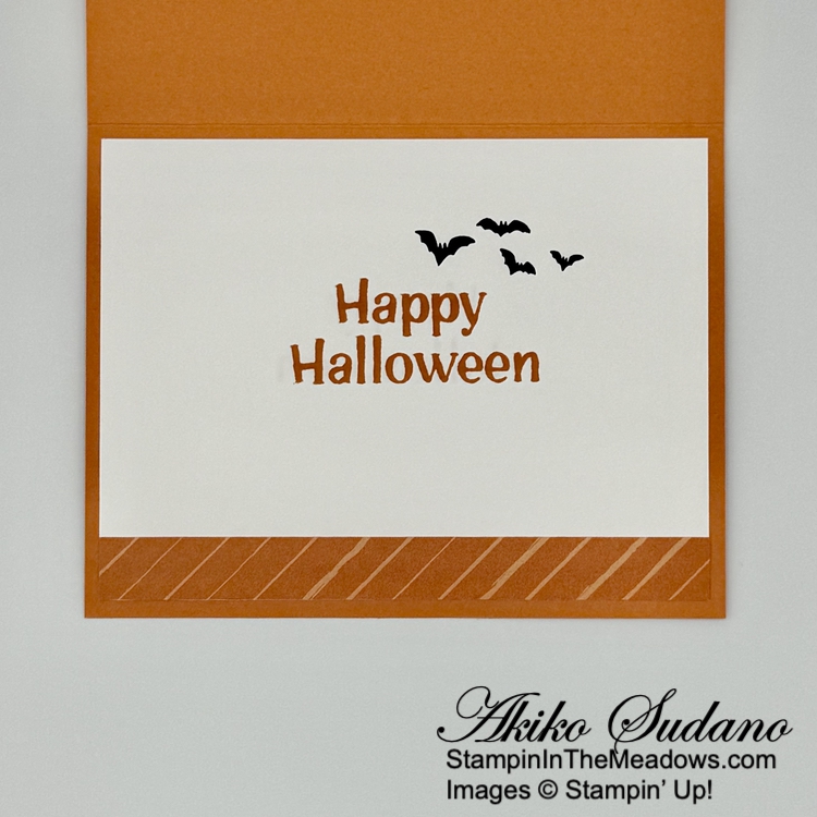 For the inside panel, stamp the sentiment from the Stampin’ Up! Spooky Halloween stamp set using Timid Tiger ink on a Basic White panel. Stamp the bats in Secret Sea and adhere DSP to the bottom. Adhere the panel to the inside of the card with Stampin’ Seal.