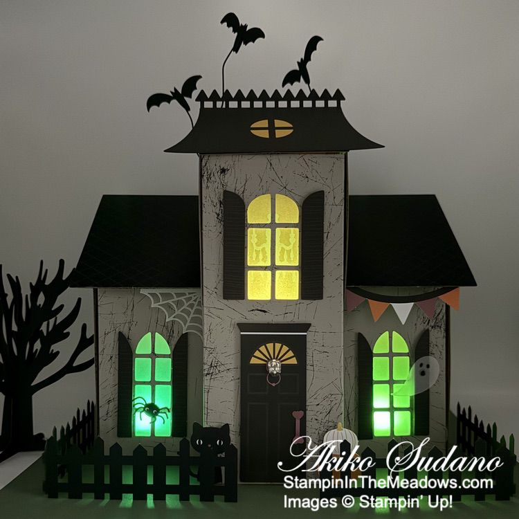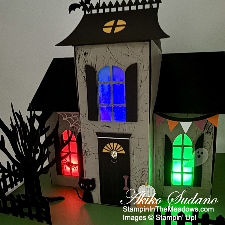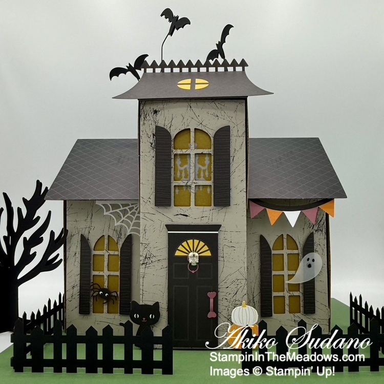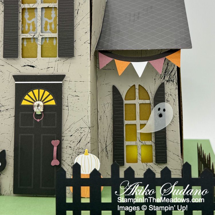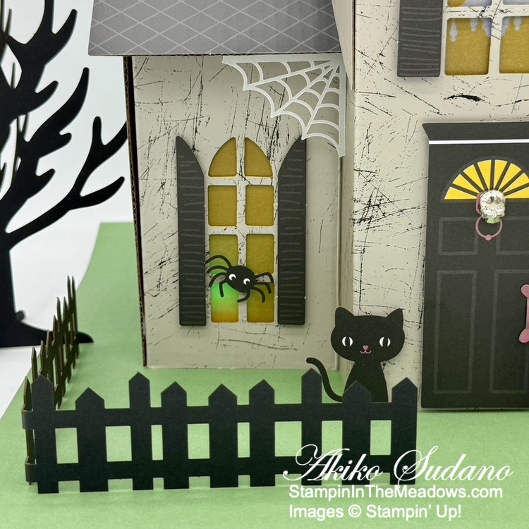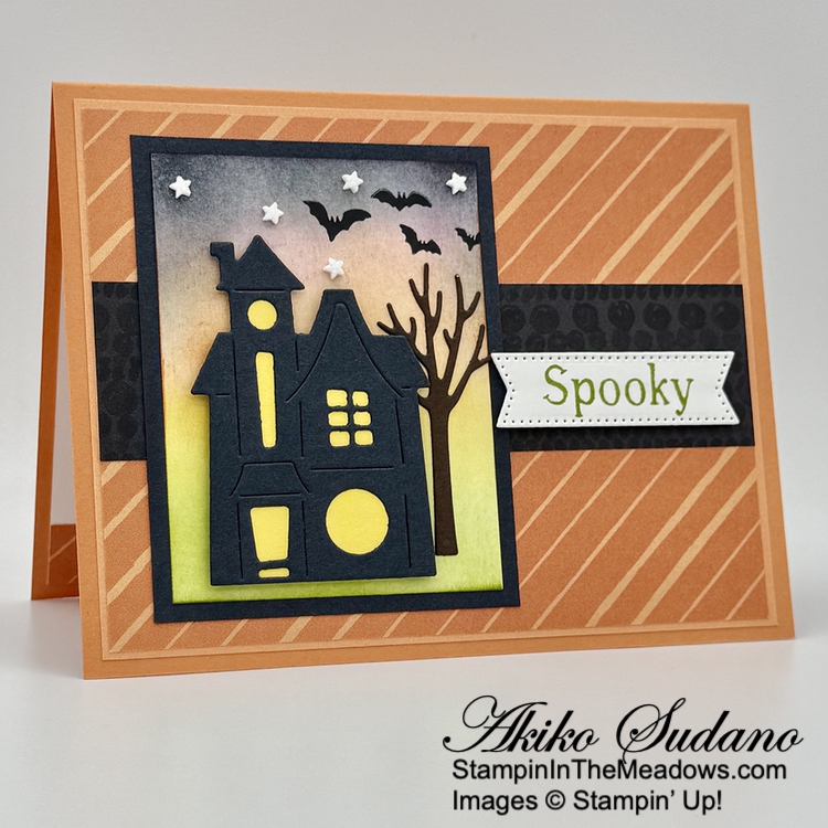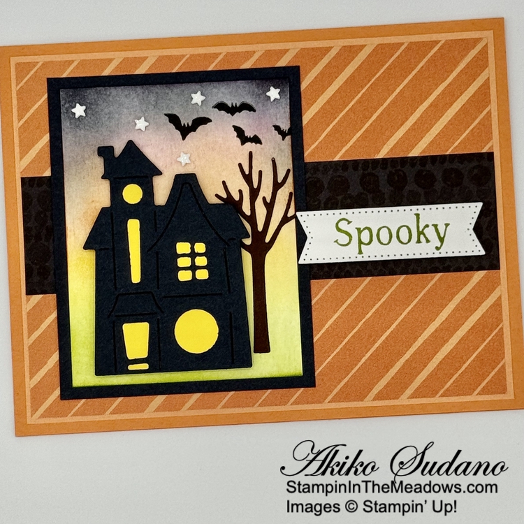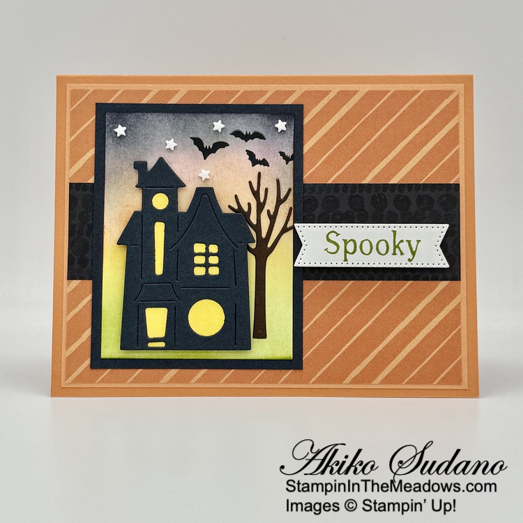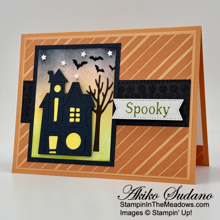 The haunted house from the Stampin’ Up! Spooky Halloween dies is just wonderful (along with the rest of the stamps and dies in the great little bundle)! But did you ever think the Celebratory Sips DSP could be used for a Halloween card? The Timid Tiger stripes make a perfect backdrop. And I love to do blended nighttime backgrounds with a haunted house for Halloween card. This one was super simple!