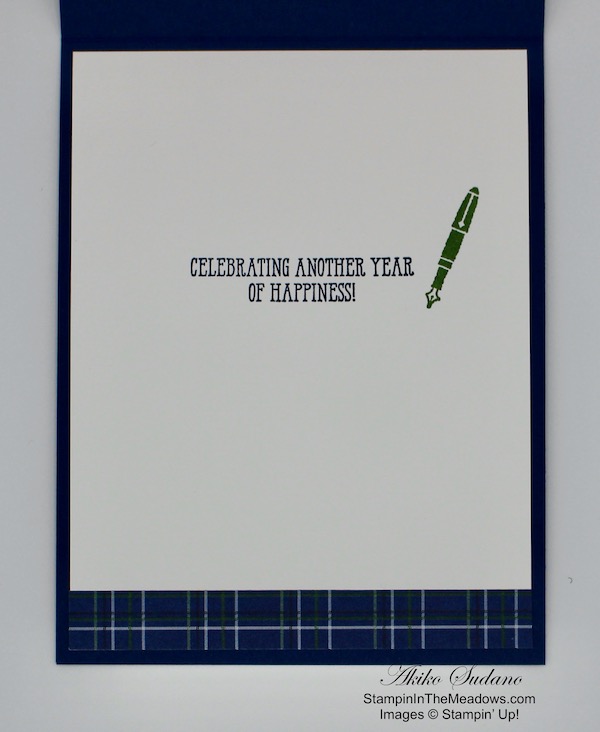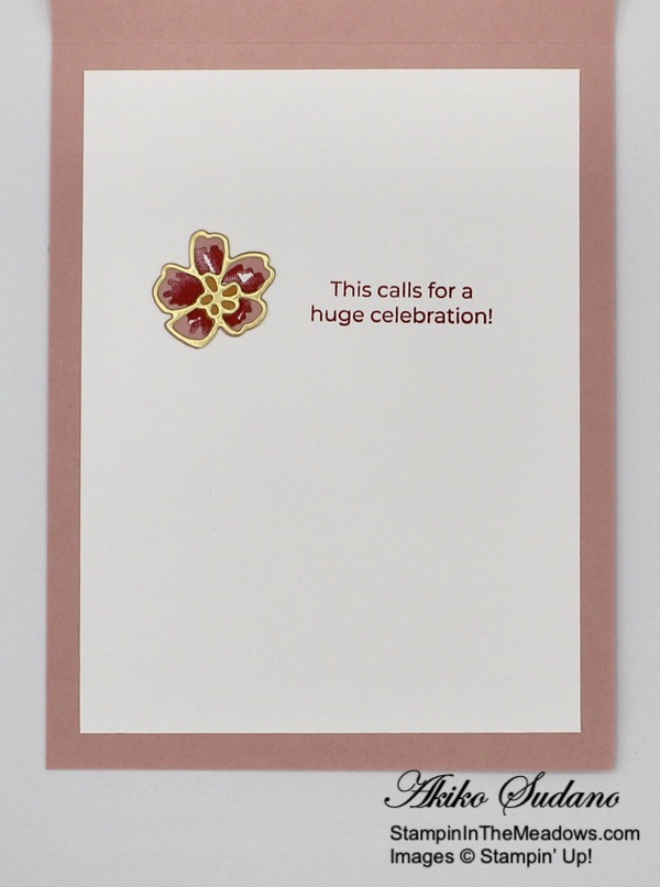 For the inside of the card, I stamped the sentiment from the Stampin’ Up! Cake Celebrations stamp set in Real Red ink on a Basic White panel. I adhered a die cut leaf sprig and flower in the corner and adhered the panel to the inside of the card with Stampin’ Seal.