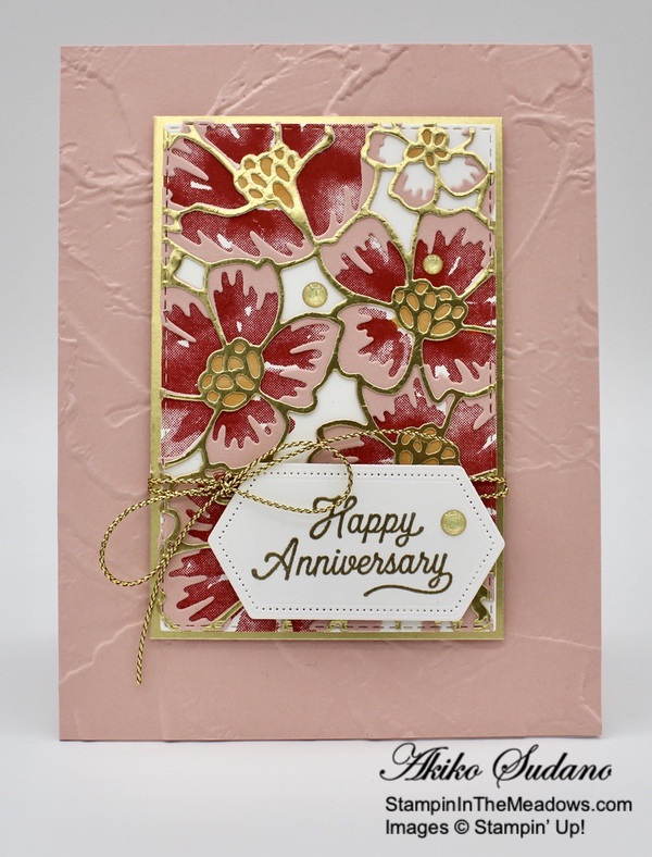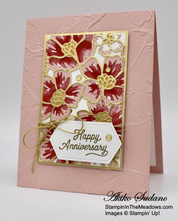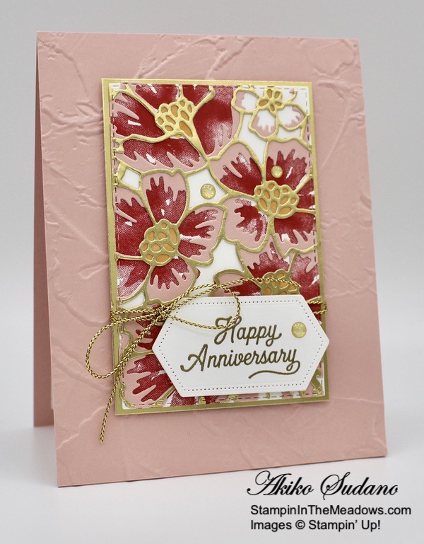 For the card front, I embossed a Basic White panel with the Distressed tile embossing folder and cut a Gold Foil panel with the die from the Perennial Postage dies. I adhered the embossed panel to the die cut foil and adhered it to the short front flap of DSP. I also cut the cake stand from the Stampin’ Up! Cake Celebrations dies from Gold foil and adhered it together.