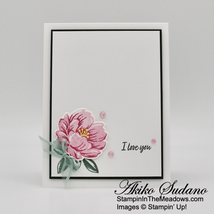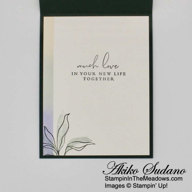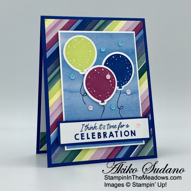 I stamped the sentiment from the Stampin’ Up! Beautiful Balloons stamp set in Blueberry Bushel ink on Basic White and adhered it to a Blueberry Bushel mat and. I adhered it to the front of the card with glue dots and finished the card front with pastel sequins.
