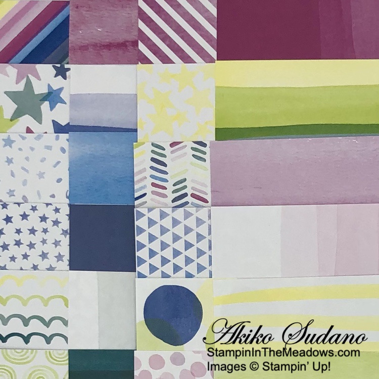 And here are the pretty patterns in the Bright and Beautiful 6″ x 6″ designer series paper. There are so many fun designs and solids in Lemon Lime Twist, Pretty Peacock, Azure Afternoon, Blueberry Bushel, Berry Burst and Bubble Bath.