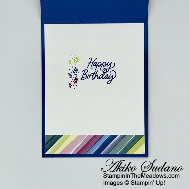 For the inside of the card, I stamped the sentiment from the Stampin’ Up! Beautiful Balloons stamp set in Blueberry Bushel ink on a Basic White panel. I stamped the streamers in Blueberry Bushel, Lemon Lime Twist and Berry Burst ink. I adhered a strip of DSP to the bottom and adhered the panel to the inside of the card with Stampin’ Seal.
