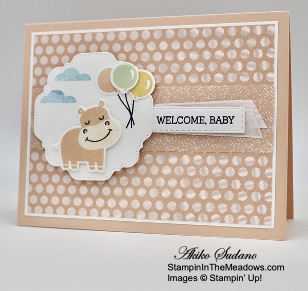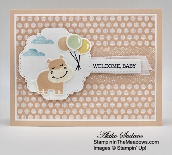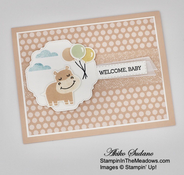 Stamp the balloon strings from the Stampin’ Up! Hippo Happiness stamp set in Memento Tuxedo Black and the clouds from the Moving Along stamp set in stamped off Balmy Blue on the fancy Whisper White die cut. Adhere the balloons with glue dots and dimensionals and adhere the hippo with dimensionals. Stamp the sentiment from the Moving Along stamp set in Memento Tuxedo Black ink on Whisper White and cut it out with the small skinny Stitched Rectangles die. Adhere it to a folded Whisper White ribbon and then to the card front with glue dots. Pop the hippo fancy panel on the card front with dimensionals.