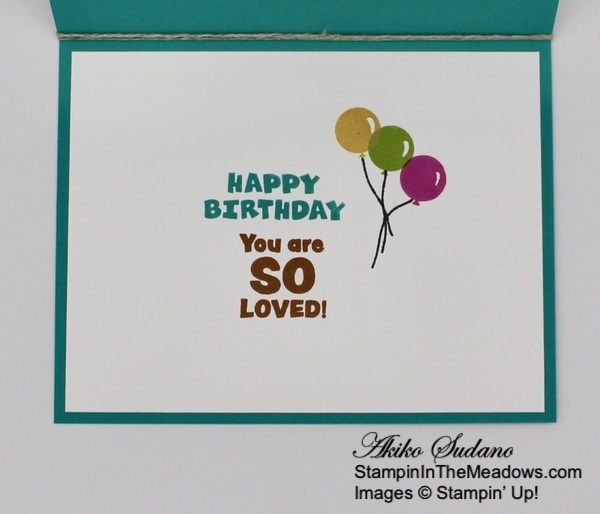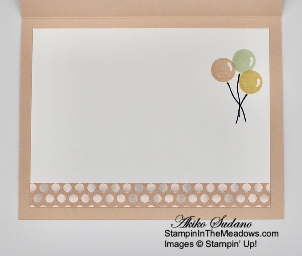 For the inside, stamp the balloons in Petal Pink, So Saffron and Soft Sea Foam on a Whisper White panel. Adhere a strip of Petal Pink Subtles 6″ x 6″ DSP to the bottom of the panel and adhere the panel to the inside of the card.