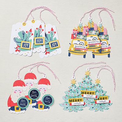 Here are the last two tags. The DSP patterns from the A Little Bit Festive pack layer nicely with Real Red, Pool Party and Basic White card stock. I love the long strip die cuts from the Greetings of the season dies