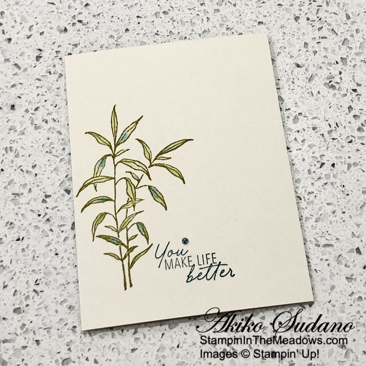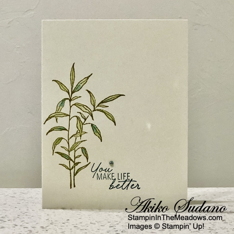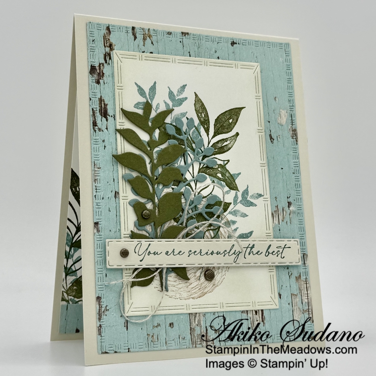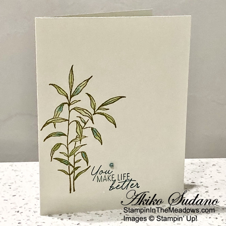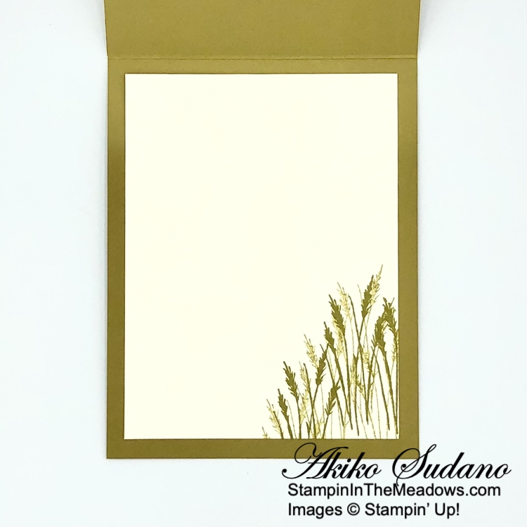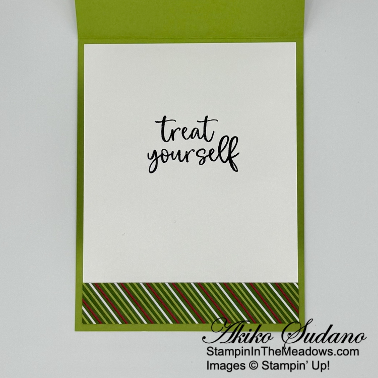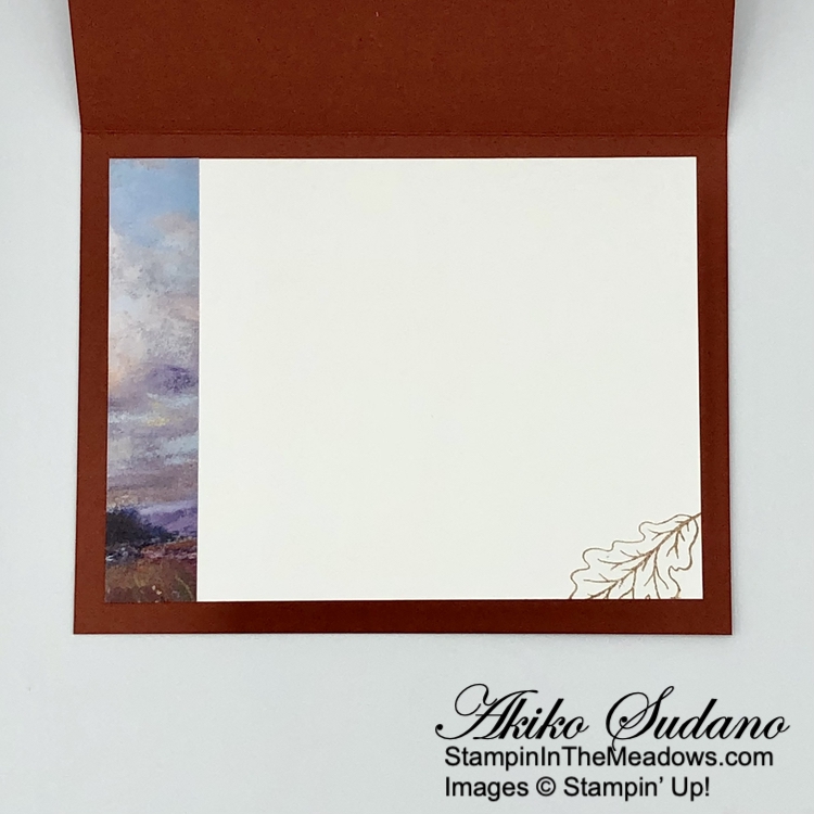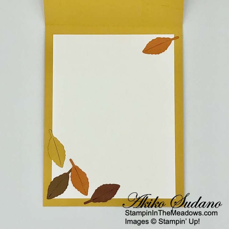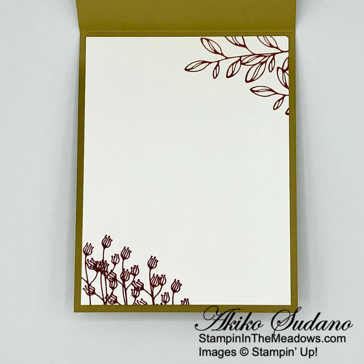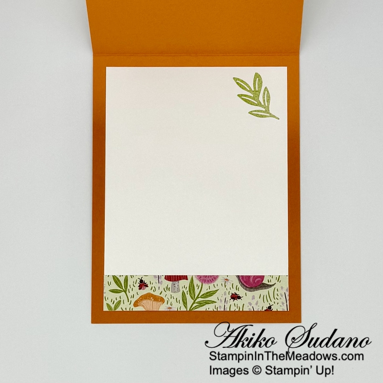 For the inside of the card, I stamped the leaf from the Stampin’ Up! Terrific Toadstools stamp set using Garden Green ink. I trimmed the bottom of the panel with DSP and adhered the panel to the inside of the card with Stampin’ Seal.