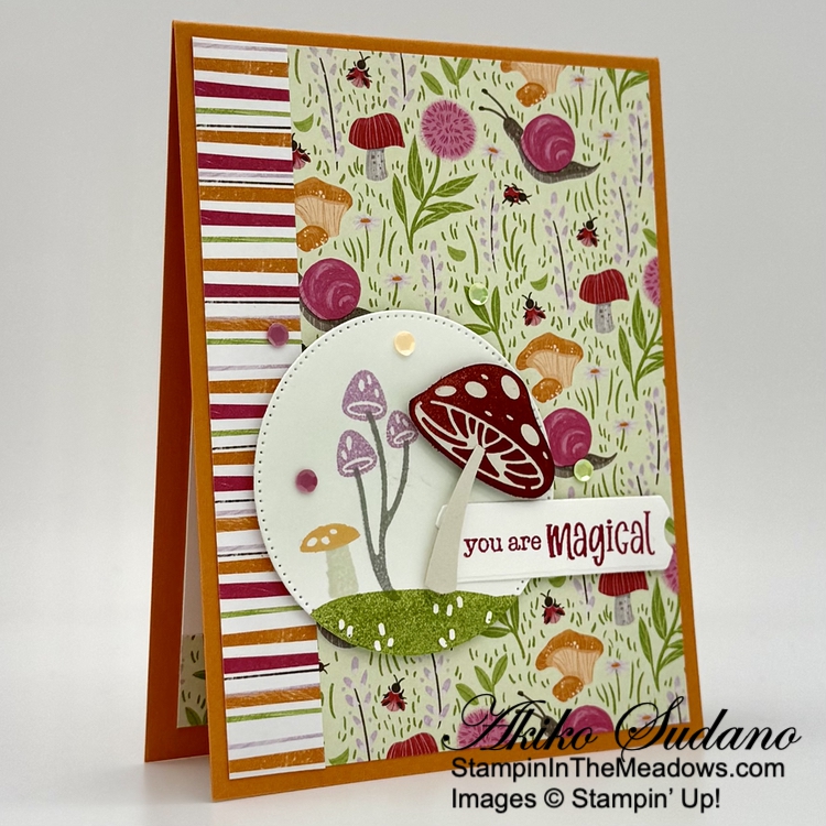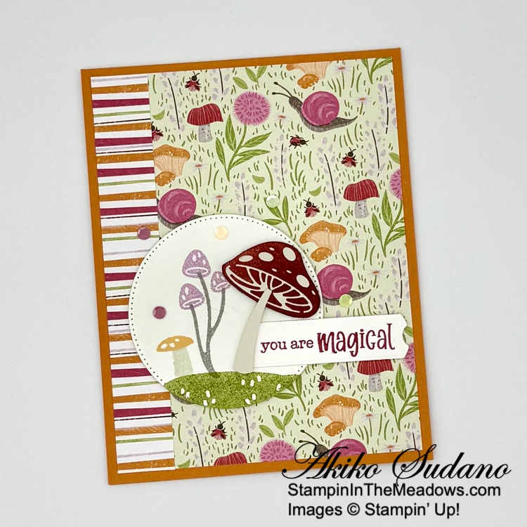 I stamped the sentiment from the Stampin’ Up! Terrific Toadstools stamp set using Melon Mambo ink on Basic White and cut it out with a die from the Unbounded Love dies. I popped the die cut circle on the card with dimensionals and adhered the label with dimensionals and a glue dot. I adhered the large mushroom with dimensionals and finished the card with shiny sequins.