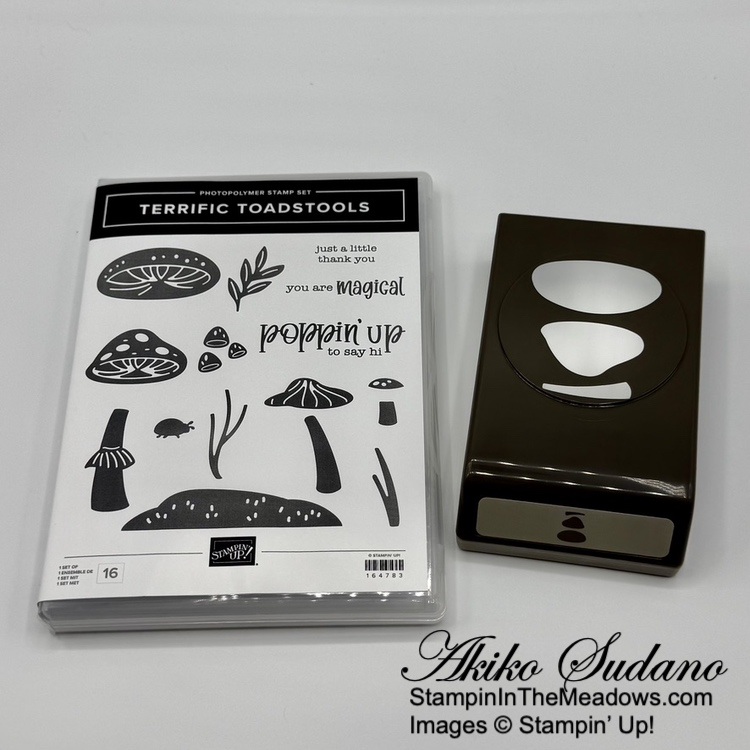 Here is the Stampin’ Up! Terrific Toadstools bundle with all the fun mushroom stamps and cute sentiments. Note that the punch cuts inside the stamped images, so that you won’t have white borders.
