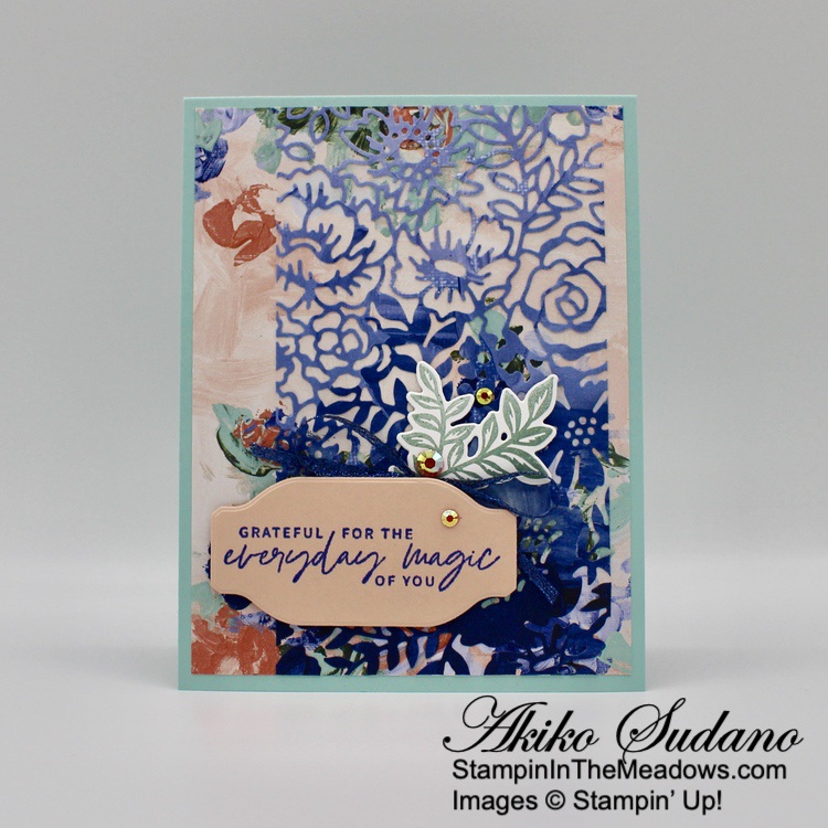 I adhered a panel of Inked Botanicals 6″ x 6″ designer series paper to a Calypso Coral mat with liquid glue. I adhered another strip of the DSP to a Lost Lagoon mat before adhering it to the panel. I popped the layered DSP panel onto the front of a Lost Lagoon card base with dimensionals.