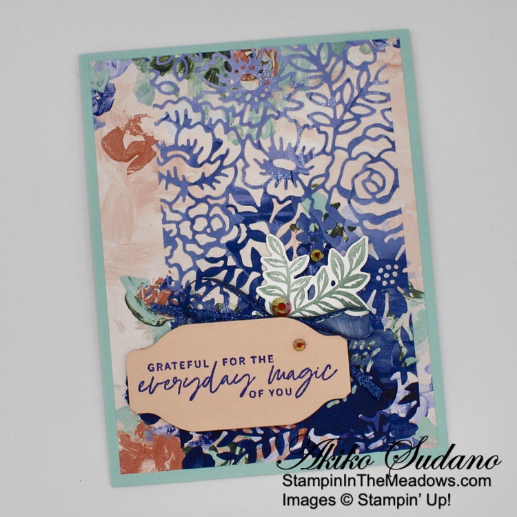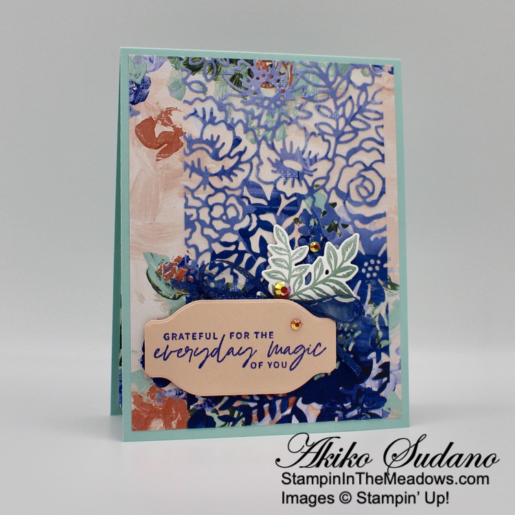 I adhered the decorated panel to the card front with dimensionals on a diagonal – so fun! I finished with Blueberry Bushel Tinsel Gems.