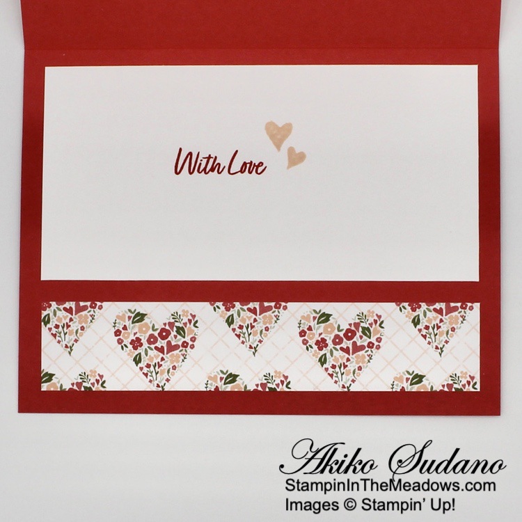I stamped the sentiment from the Stampin’ Up! Country Bouquet stamp set in Sweet Sorbet on Basic White and stamped the solid tiny hearts in Petal Pink ink. I adhered the panel to the inside of the card above the Country Floral Lane DSP.