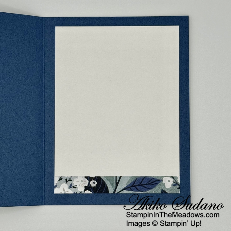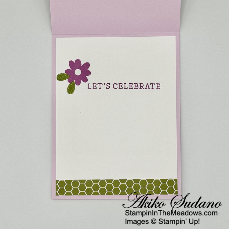 For the inside, stamp the flower from the Petals of Beauty stamp set using Petal Pink and Darling Duckling inks in the corner of a Very Vanilla panel. Trim the side with Stampin’ Up! Brushed With Beauty DSP and adhere the panel to the inside of the card with Stampin’ Seal.