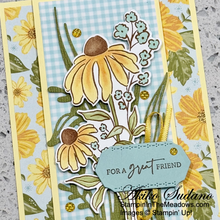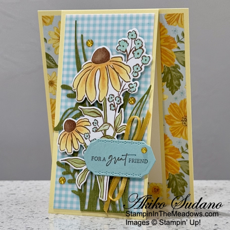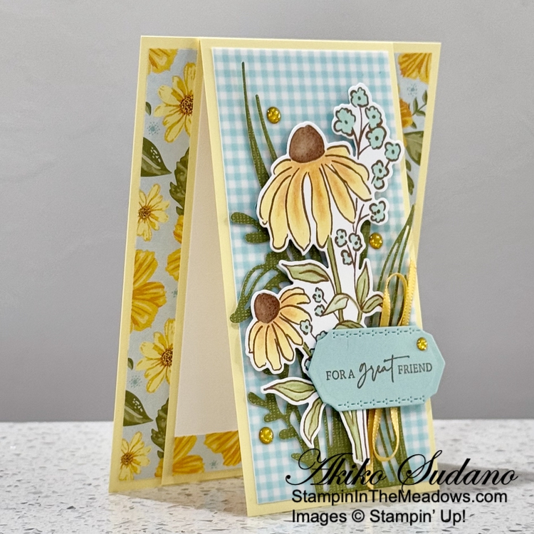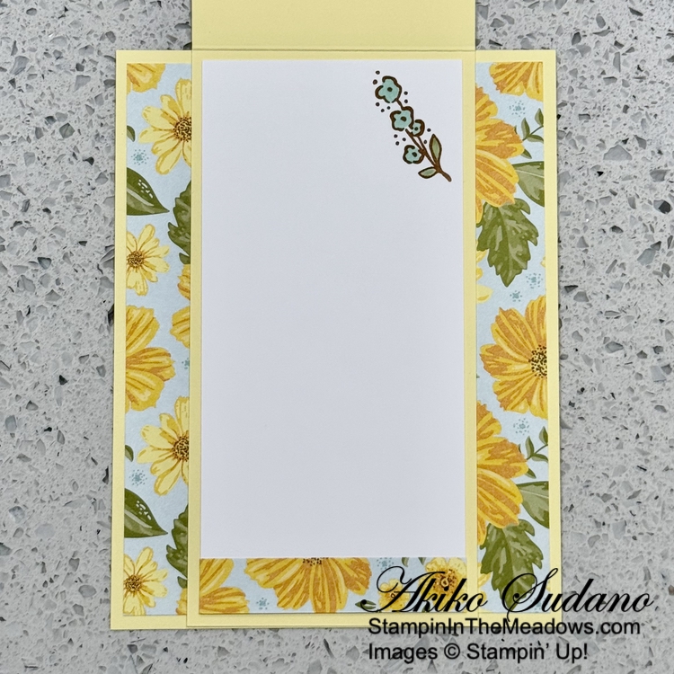 - Perennial Lavender DSP – 3″ x 5-1/4″ (front background), 1″ x 5-1/4″ (inside trim), 3″ x 4-1/4″ (die cut panel)
