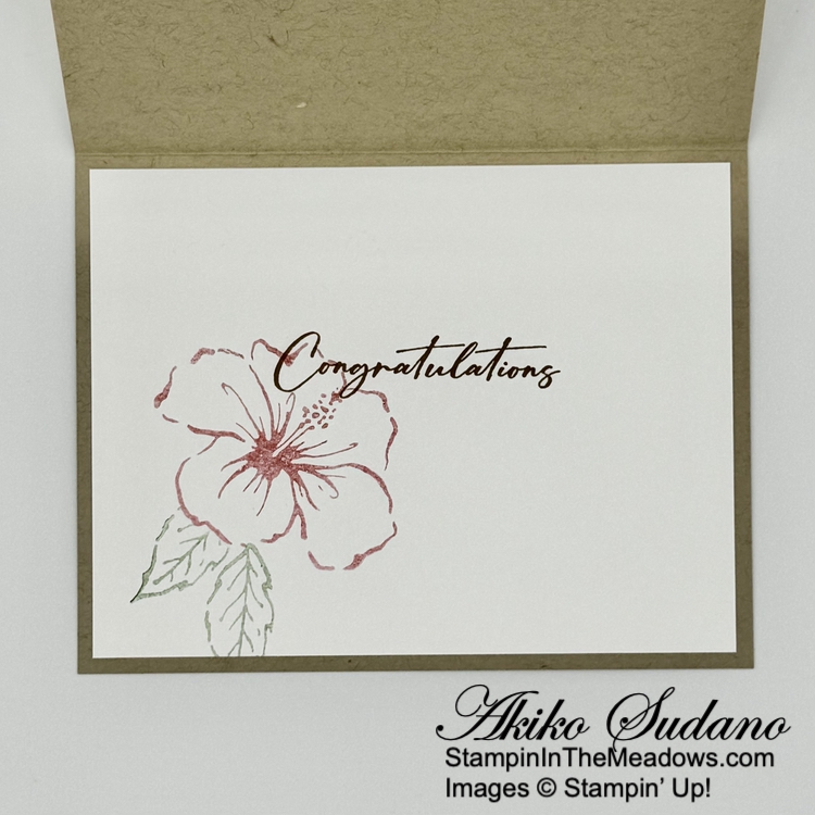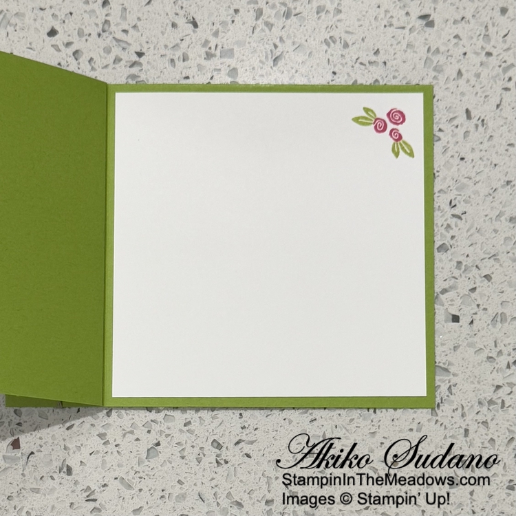 For the inside of the card, stamp the little butterfly from the Stampin’ Up! Painted Lavender stamp set using Highland Heather ink on a Basic White panel. Adhere a strip of DSP to the side and adhere the panel to the inside of the card with Stampin’ Seal so that the DSP shows when the card is closed.