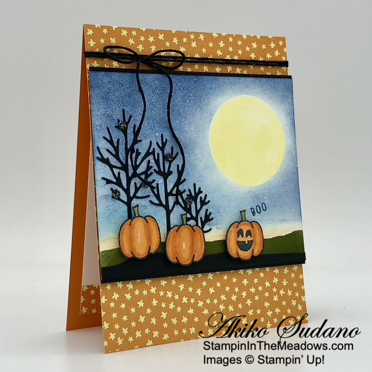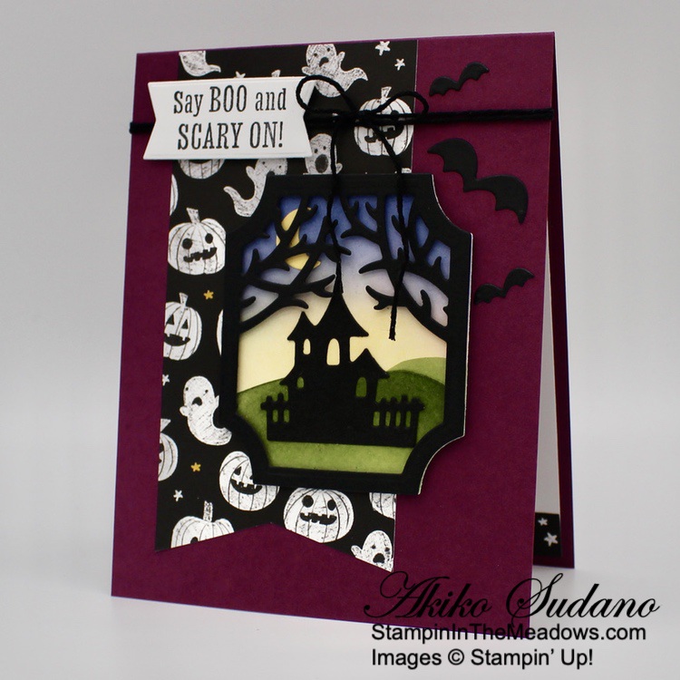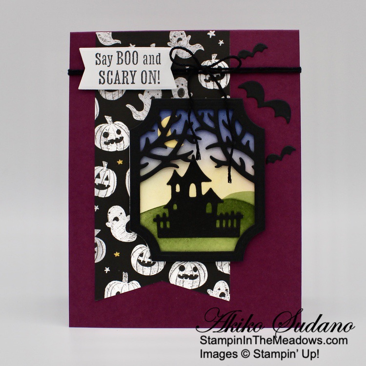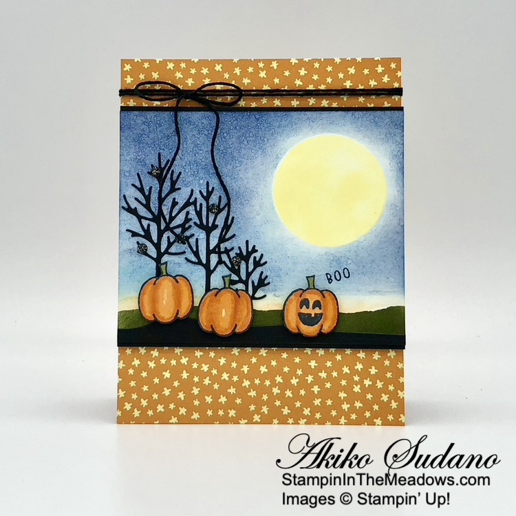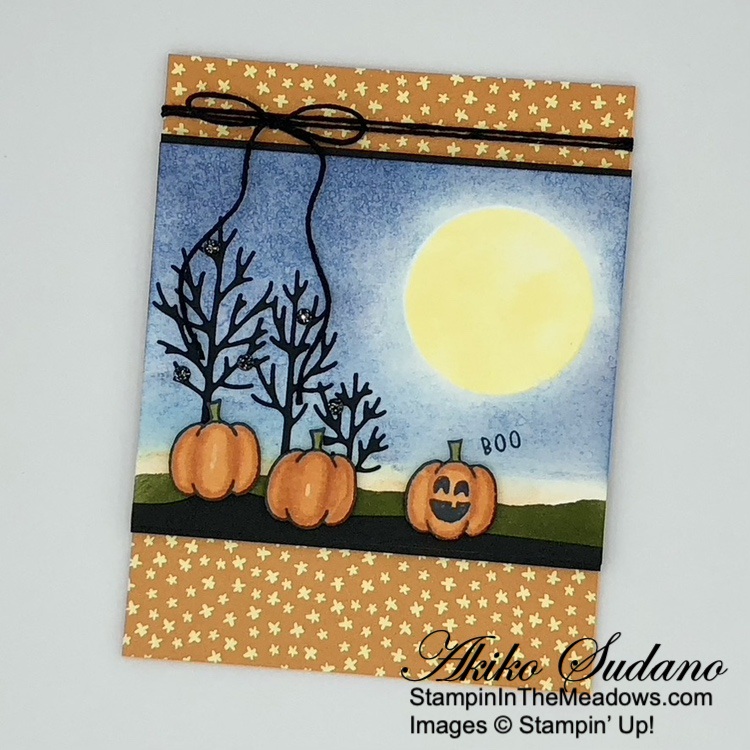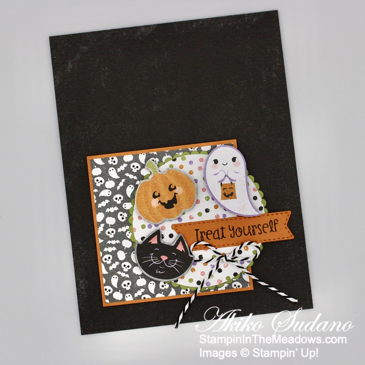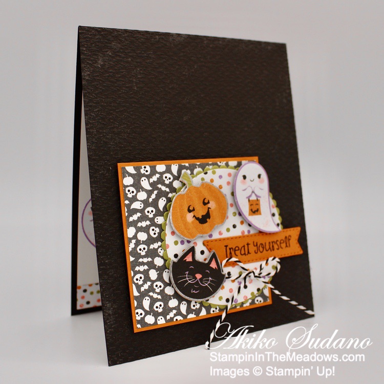 For the inside of the card, I stamped the sentiment from the Stampin’ Up! Bag of Bones stamp set in Cajun Craze ink on a Basic White panel. I stamped the three bats in Memento Tuxedo Black ink and adhered a strip of DSP to the bottom. I adhered the panel to the inside of the card with Stampin’ Seal.