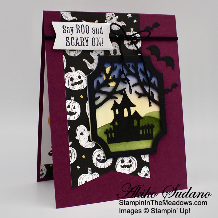 I cut three skeletons, a person, cat and dog using the Stampin’ Up! Bag of Bones dies from the Them Bones DSP and used black dimensionals to pop them on the card front. Isn’t it great to have black dimensionals? They’re perfect for these dark intricate die cuts!