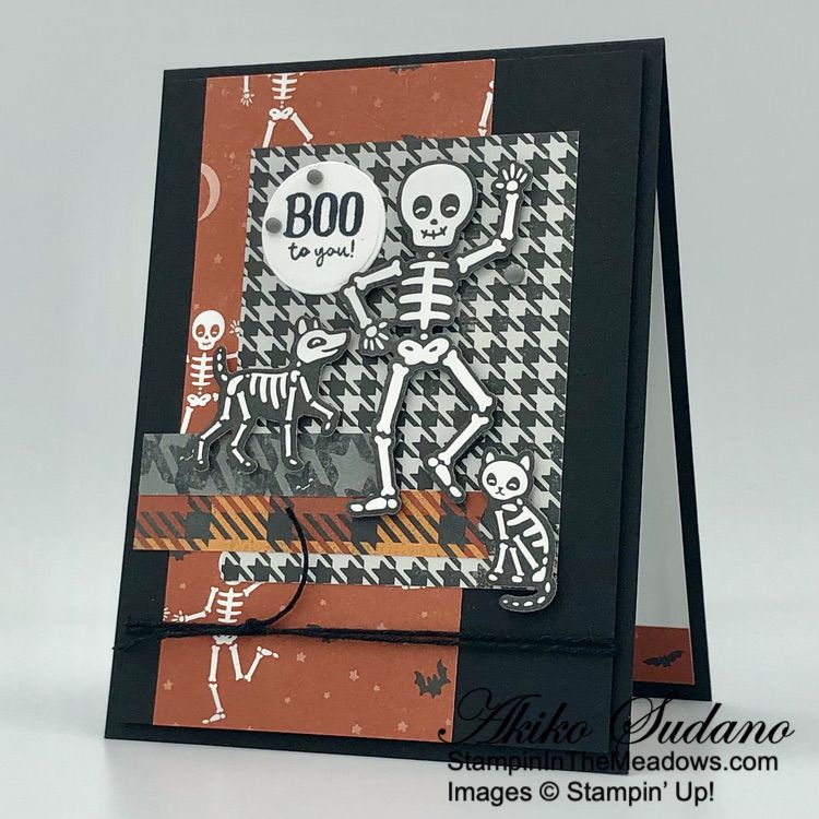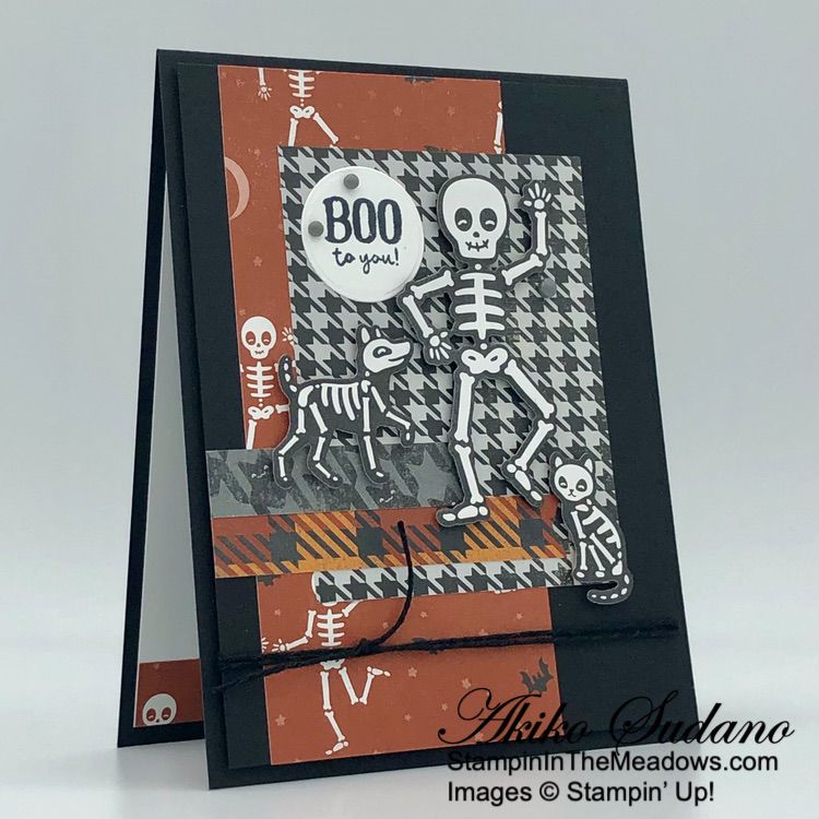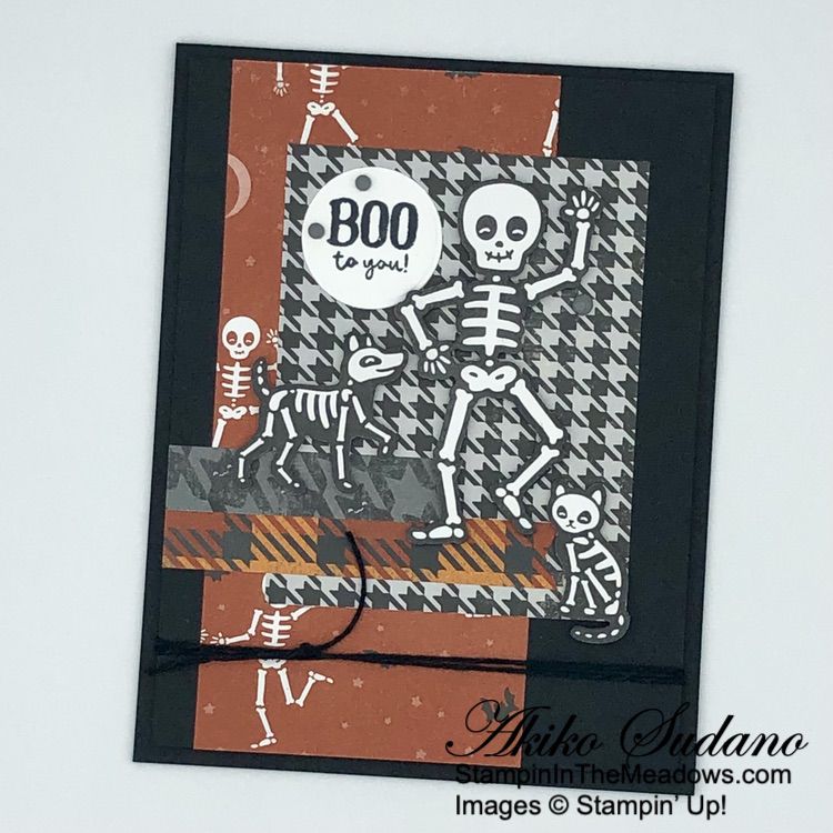 Good Morning! Tomorrow is Halloween – are you ready? I picked up my candy this weekend so I’m set. I’m so glad that we still get trick-or-treaters! So I pulled out the fun Stampin’ Up! Bag of Bones bundle and the Them Bones designer series paper to make a final Halloween card for the season. You can find the products I used at the bottom of my post along with the card stock sizes.